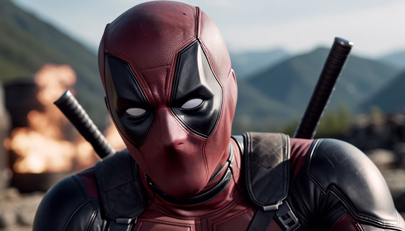 Prompt: deadpool in the top of a building with in the left hand he have a grey gun is it the sunset and he look the photo