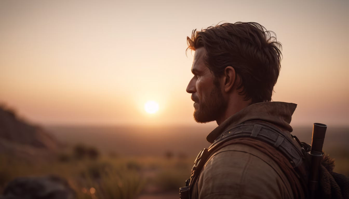 Prompt: Make a wallpaper of a survival game character looking at a horizon at sunset