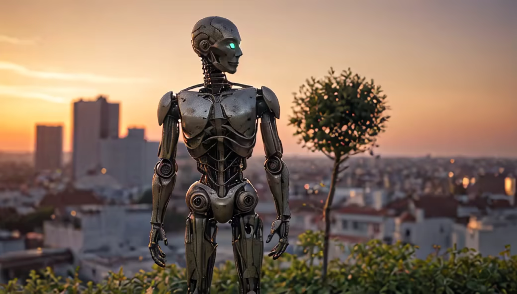 Prompt: a humanoid standing on a rooftop garden watching the sunset.