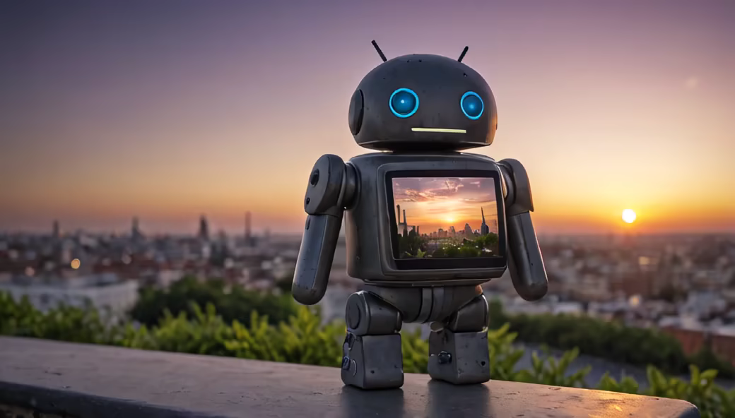 Prompt: An android on Rooftop Garden watching the sunset on the horizon.