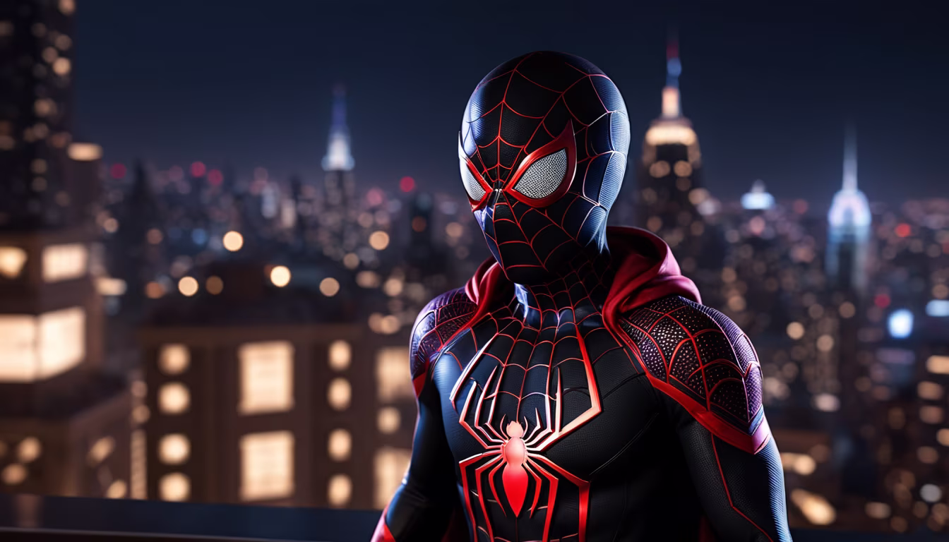 Prompt: spiderman miles morales in night hanging ina building 3d disny cinematic photo