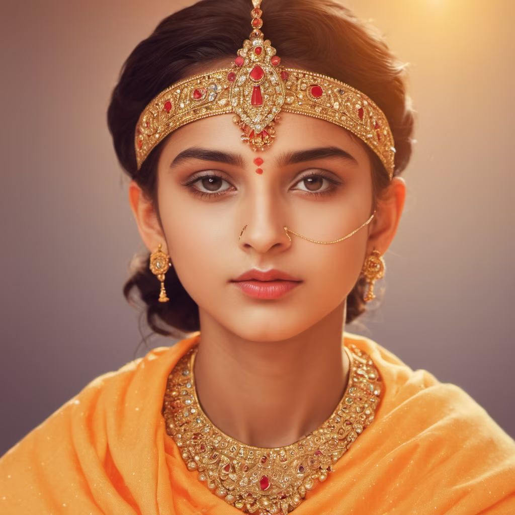 Negative: Rama's complexion as radiant as molten gold, akin to the "deep lotus flower" or the "autumnal sun." His skin emits a subtle inner glow, symbolizing purity, nobility, and divine essence. [Image of Lord Rama with lotus flower like complexion * **Hair:** Dark locks, neatly bound in a crown of braids, frame Rama's face. The color signifies wisdom, strength, and unwavering resolve, while the meticulous style reflects his regal bearing and attention to detail. Eyes: Lotus-like, wide, and captivating, Rama's eyes hold a mesmerizing depth. They shimmer with compassion and righteousness, yet possess a spark of fierce determination when needed. Their reddish tinge hints at his divine lineage and fiery spirit. [Image of Lord Rama with lotus like eyes] Face: Oval and perfectly proportioned, Rama's face exudes an aura of serenity and grace. His features are chiselled yet gentle, showcasing a perfect blend of earthly charm and divine majesty. A hint of a smile often plays upon his lips, speaking volumes of his inner kindness and unwavering optimism. Torso:Broad shoulders tapering to a lean waist, Rama's torso embodies strength and unwavering resolve. His muscles, toned and defined, hint at his prowess as a warrior, while his graceful posture reflects his inherent nobility and regal bearing. Hands: Long and slender, Rama's hands exude both gentleness and unwavering power. They are capable of wielding the mighty Sharanga bow with unmatched precision, yet are equally adept at offering solace and comfort. The fingers, adorned with rings engraved with divine symbols, further emphasize his connection to the celestial realm. Legs:Strong and agile, Rama's legs carry him through countless journeys and challenges. They symbolize his unwavering determination and steadfastness, enabling him to traverse treacherous terrains and emerge victorious against daunting odds