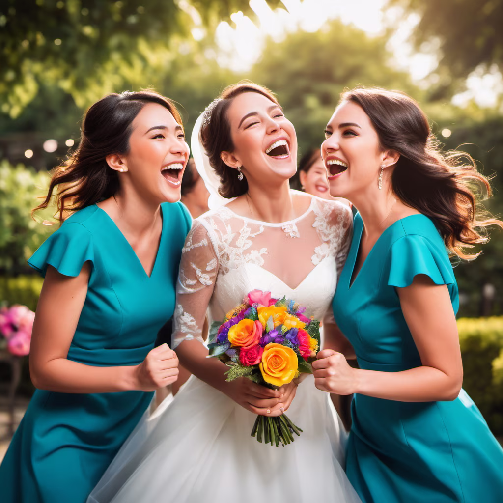 Prompt: A joyful scene in comic style depicting four bridesmaids encircling the bride, hands joined in celebration. Dynamic and vibrant, radiating happiness and unity. Comic book aesthetic with bold lines and bright colors, resembling a cheerful illustration. Shot with a Nikon D750 and a 35mm f/1.4 lens to capture the entire group in the frame. Playful, natural lighting emphasizing the lively atmosphere. Outdoor environment, a picturesque garden setting, capturing the essence of a joyous wedding celebration.