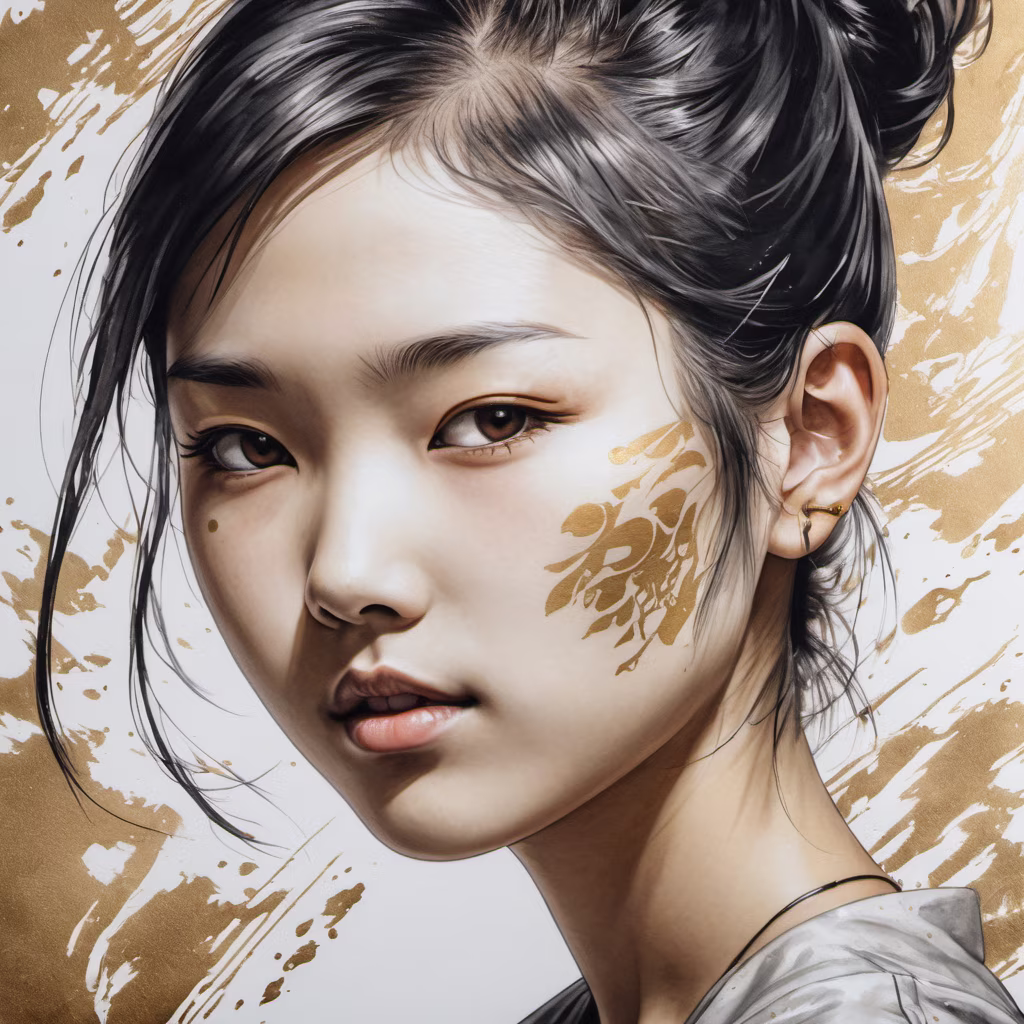 Prompt: Ink painting, young girl, golden tattoo, close-up of the face,style for Miho Hirano
