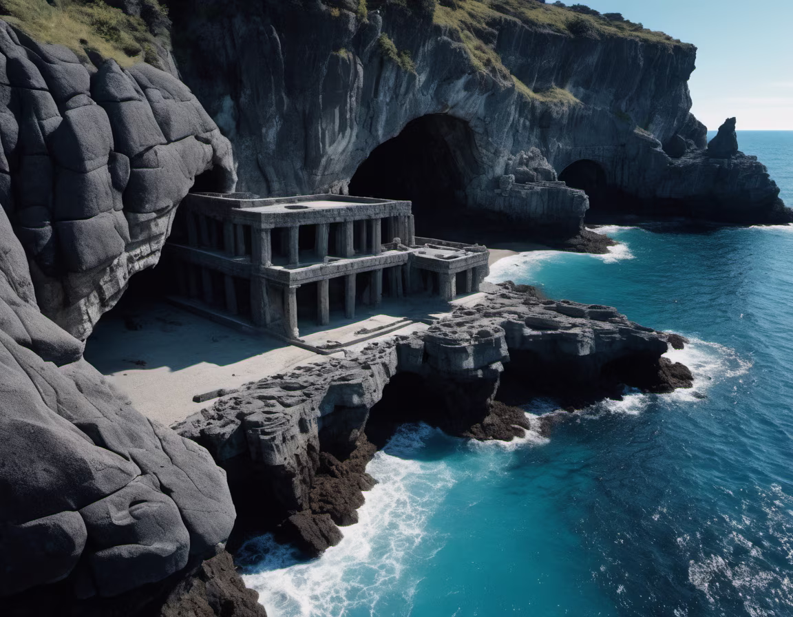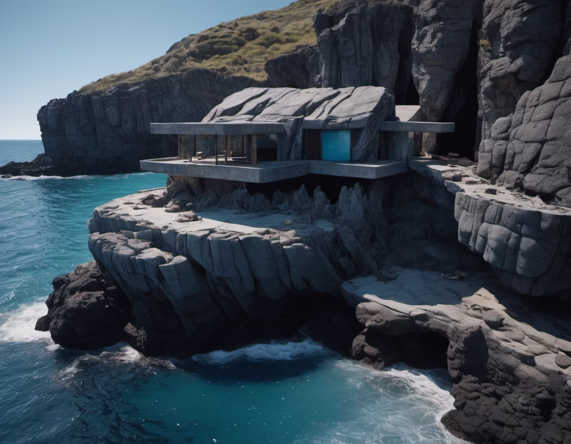 Prompt: image of an isolated retreat carved in the natural formation of the rocks next to a rocky beach, Building carved in a big volcanic stone, brutalist architecture, dark stone and light blue water color palette
