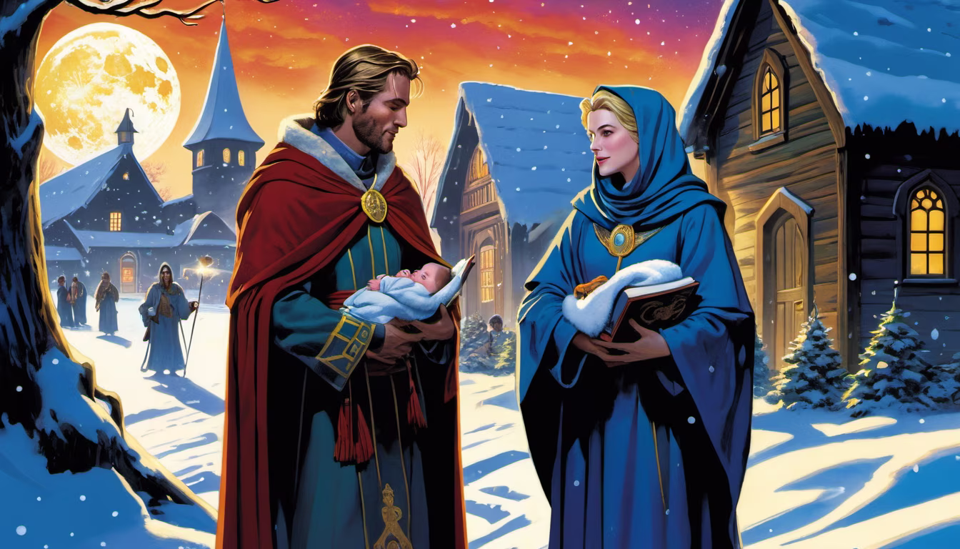 Prompt: Christmas story, full body, three wise men, the Virgin Mary holding baby Jesus, snowdrifts, twilight, darkness, it's snowing, it's blizzarding, winter, snowflakes, glow, halo, sparks of light, splashes of light, Christmas decorated with toys, against the background of a magical dream village an ancient pet barn, fairy moon, starry sky, sci-fi, fantasy, Slavic Orthodox style, warcraft style, 40s, sharp focus, detailed, colored, vibrant color, soft light, soft shadows, highly detailed face, high quality, detailed background and surroundings, ambience, realism, by Frank Miller Alex Ross Rowena Morrill