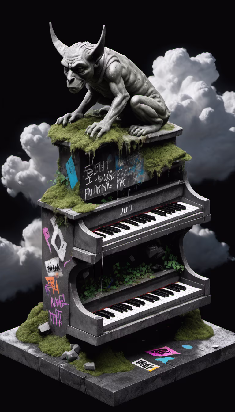 Prompt: A mini 3D floating isometric model Brutalist architecture few moss cement gargoyle fountain on piano adorned covered with graffiti texts and torn posters on the walls , in clouds, Oil painting, Impressionism, stroke, moody,dimly dark,sci-fi concept art,highly detailed, beautiful scenery,architecture,64k, high resolution, black background