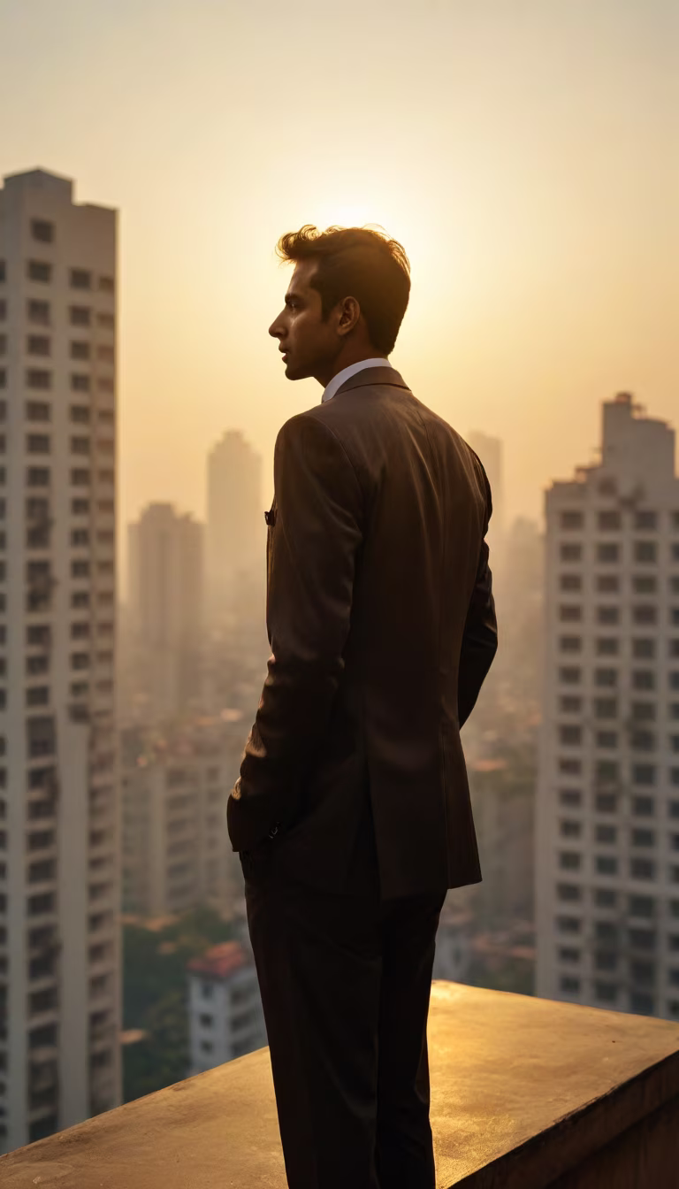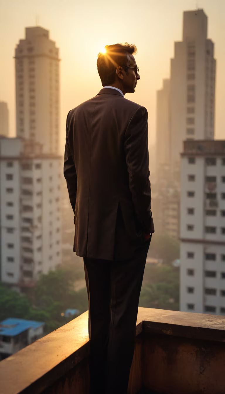 Prompt: back shot of a rich man on top of a building looking at sun rising from behind buildings, mumbai thane hiranandani