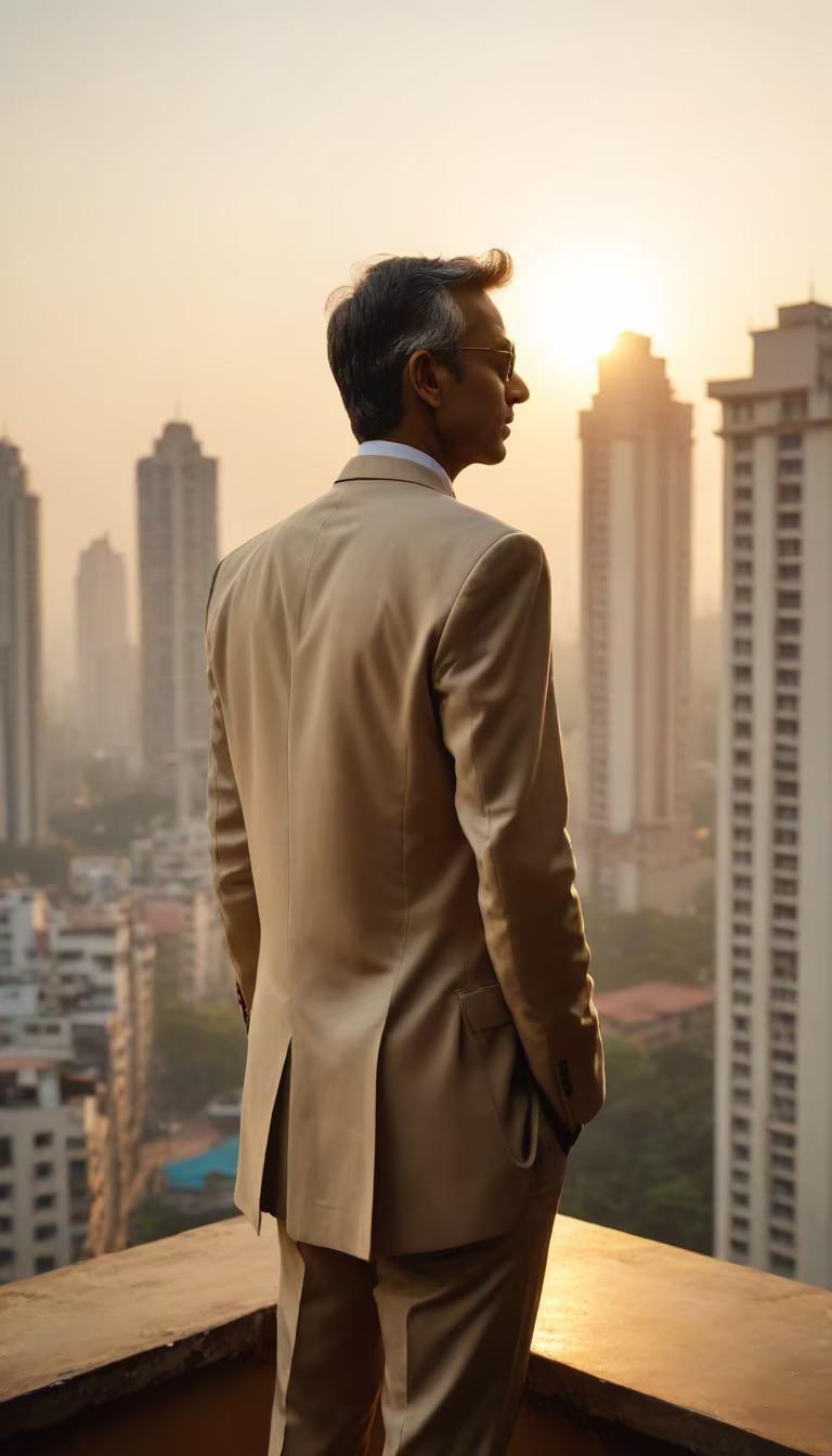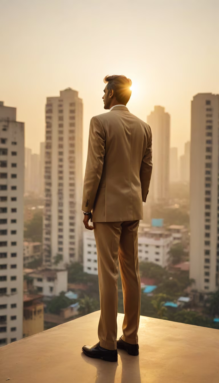 Prompt: back shot of a rich man on top of a building looking at sun rising from behind buildings, the buildings look new and are beige in color, mumbai thane hiranandani