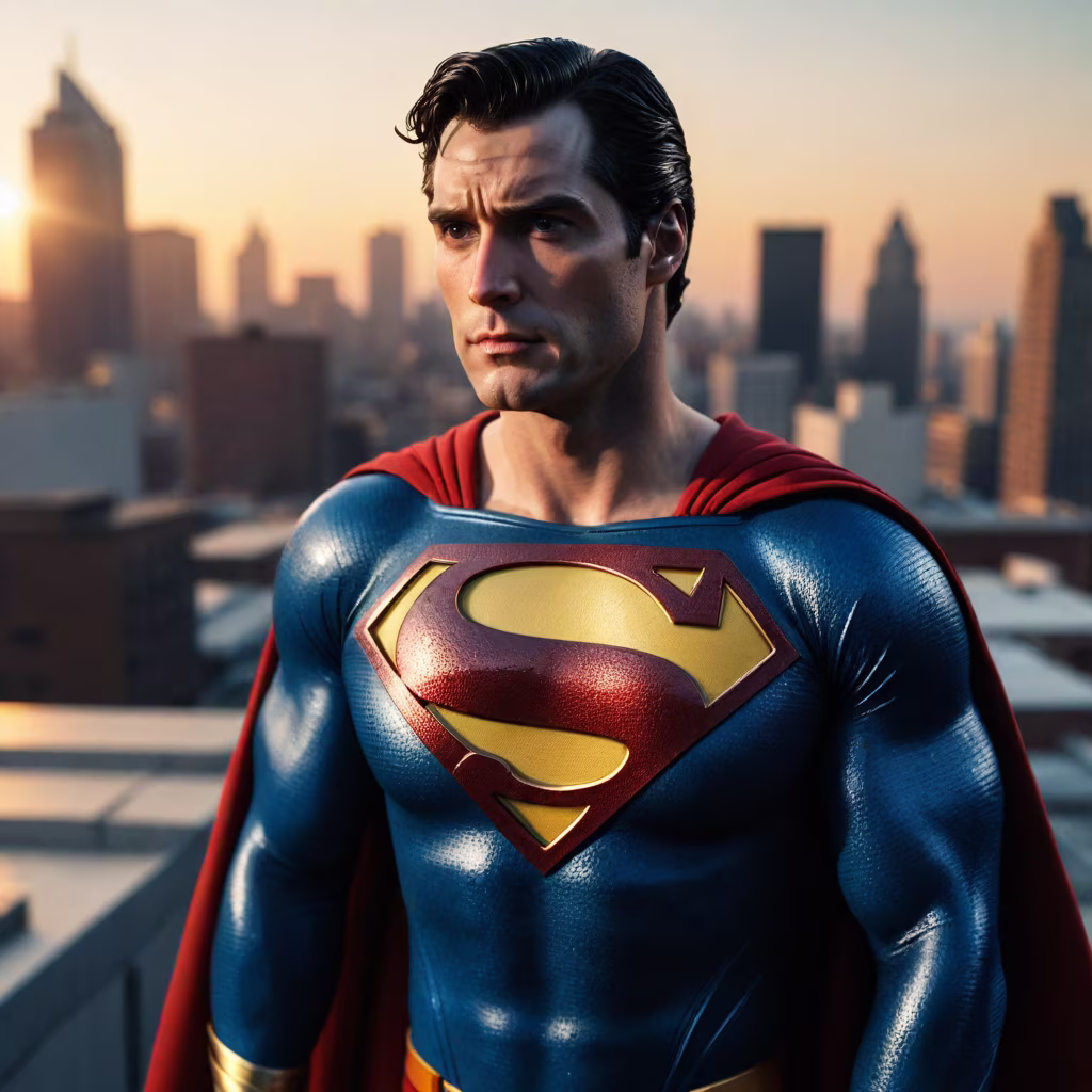 Prompt: Superman Steve Carol , heroic facial expression, torso, hero movie poster, masterpiece, hyperrealistic, ultra detailed, photorealism, official work, 16k resolution,on a rooftop,sunset,city in the background