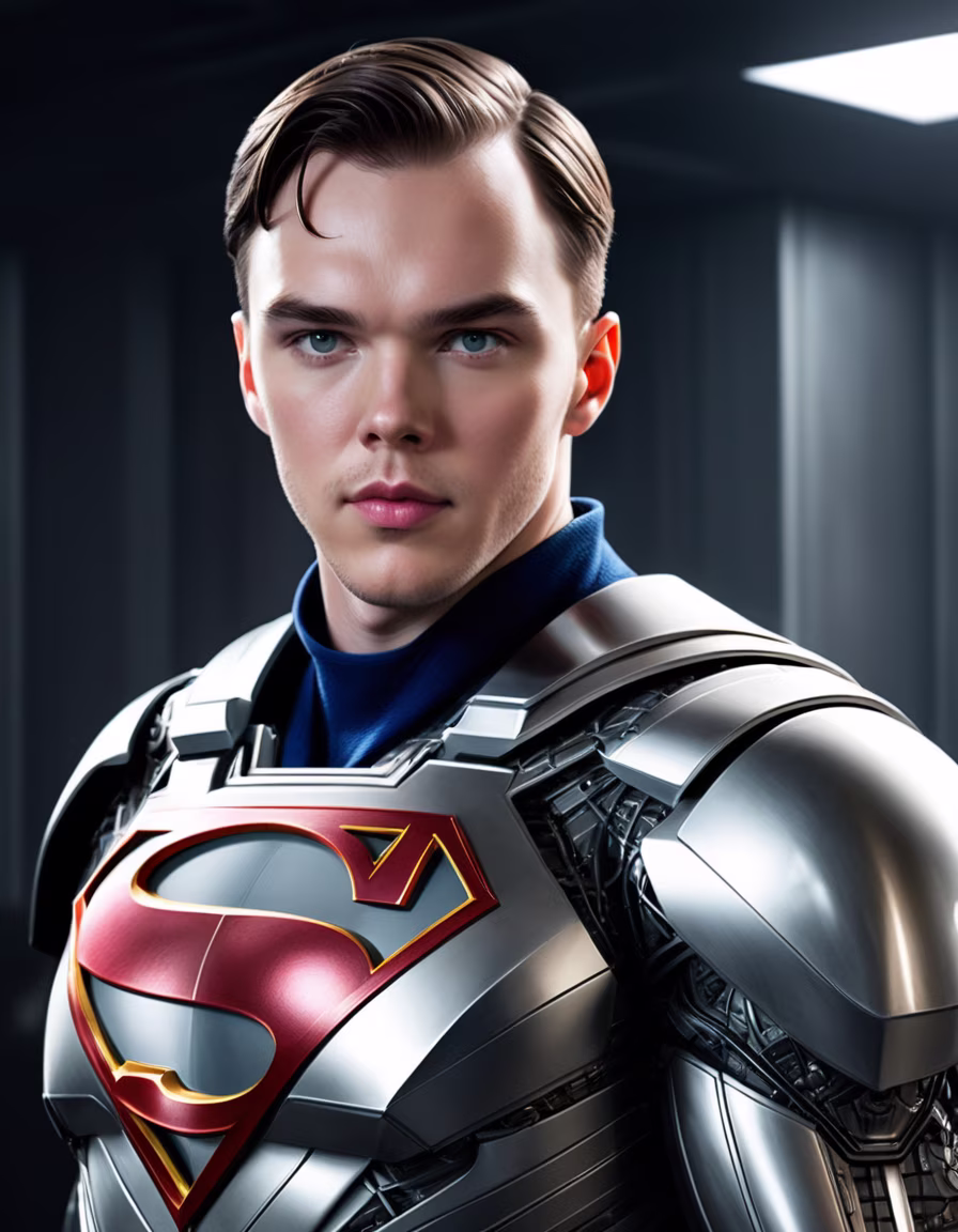 Prompt: An ultra realistic image of Nicholas Hoult as Lex Luthor, he is wearing technological armor, silver steel armor, with the LED Superman emblem. High definition rendering captures every detail of his face. In a technological fortress. Atmospheric lighting. Full body.