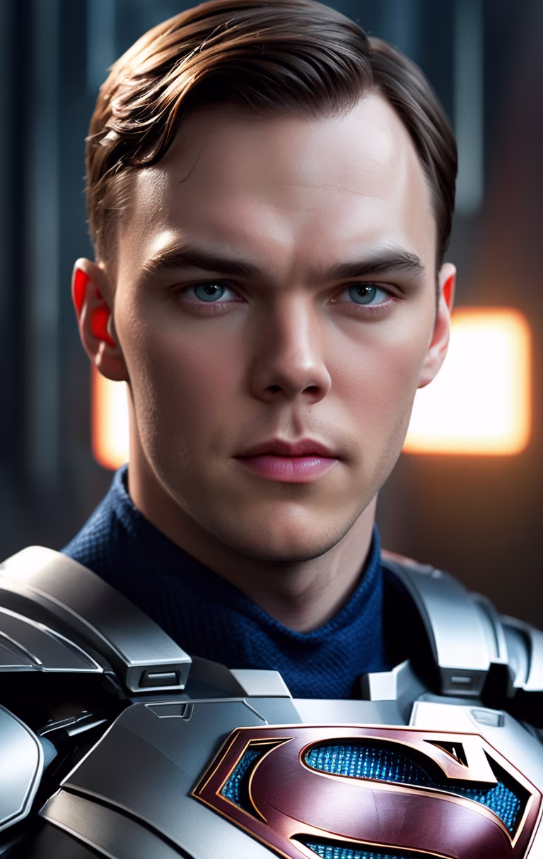 Prompt: An incredibly realistic depiction of Nicholas Hoult as Lex Luthor, clad in Superman's steel armor, the glowing green trim powered by kryptonite. The intricate details of the armor and the intense expression on Hoult's face make this image truly unique and captivating.