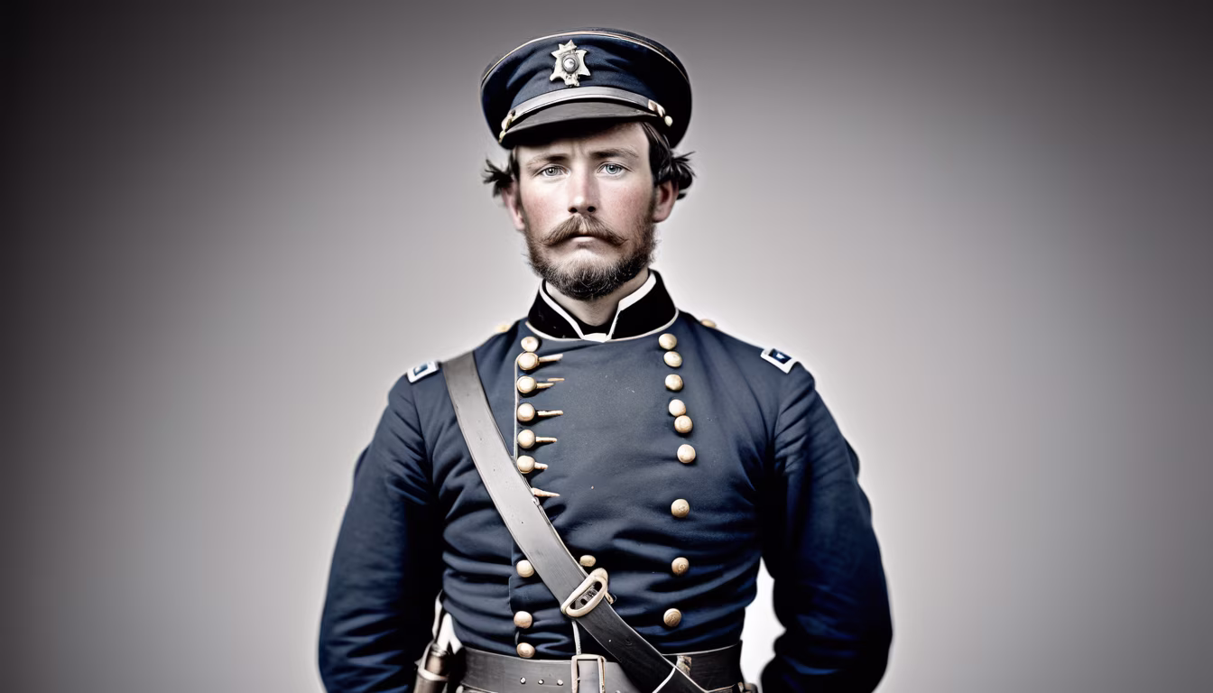 Prompt: 1870s us civil war union soldier, antique wet-plate photograph , white background, monochrome picture in style of Timothy O'Sullivan
