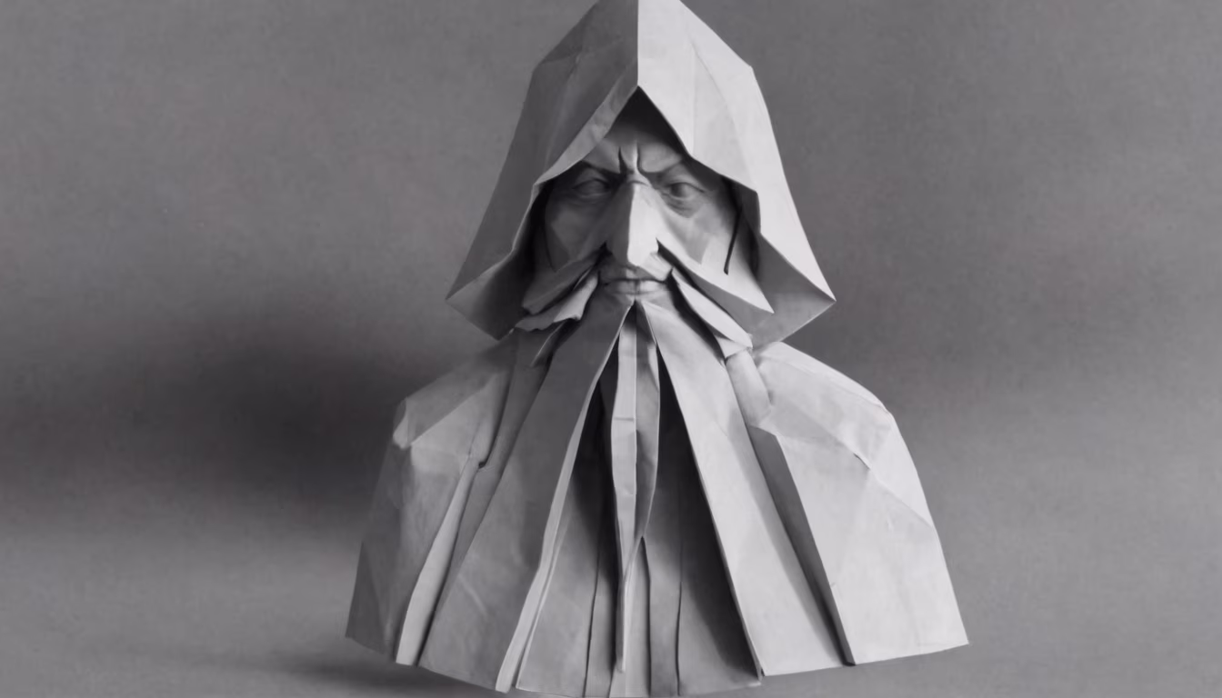 Prompt: The back of a wise thinker, black and white, occupies half of the screen, and the other half of the screen is a gradient color, from gray to white;