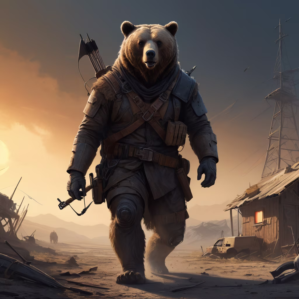 Prompt: [Dystopian Dutch angle, post-apocalyptic cabin, lone bear voyager, dark suit, survivalism, Mad Max-esque character design, cinematic Artgerm, city view, Jakub Rozalski illustration, Alex Andreev's landscape, Alan Lee's hills, ambient lighting, high-resolution, crisp edges, perfect print quality:improvised bow weapon, makeshift armor, survival instincts, wary eyes, ragged fur, post apocalypse, dusty coat, windswept landscape, golden hour lighting, sharp details, realistic textures, Frank Frazetta style, concept art quality, medieval archer reference, wildlife portrait, survival narrative, attention to claws and teeth, predatory stance, majestic bear:10]