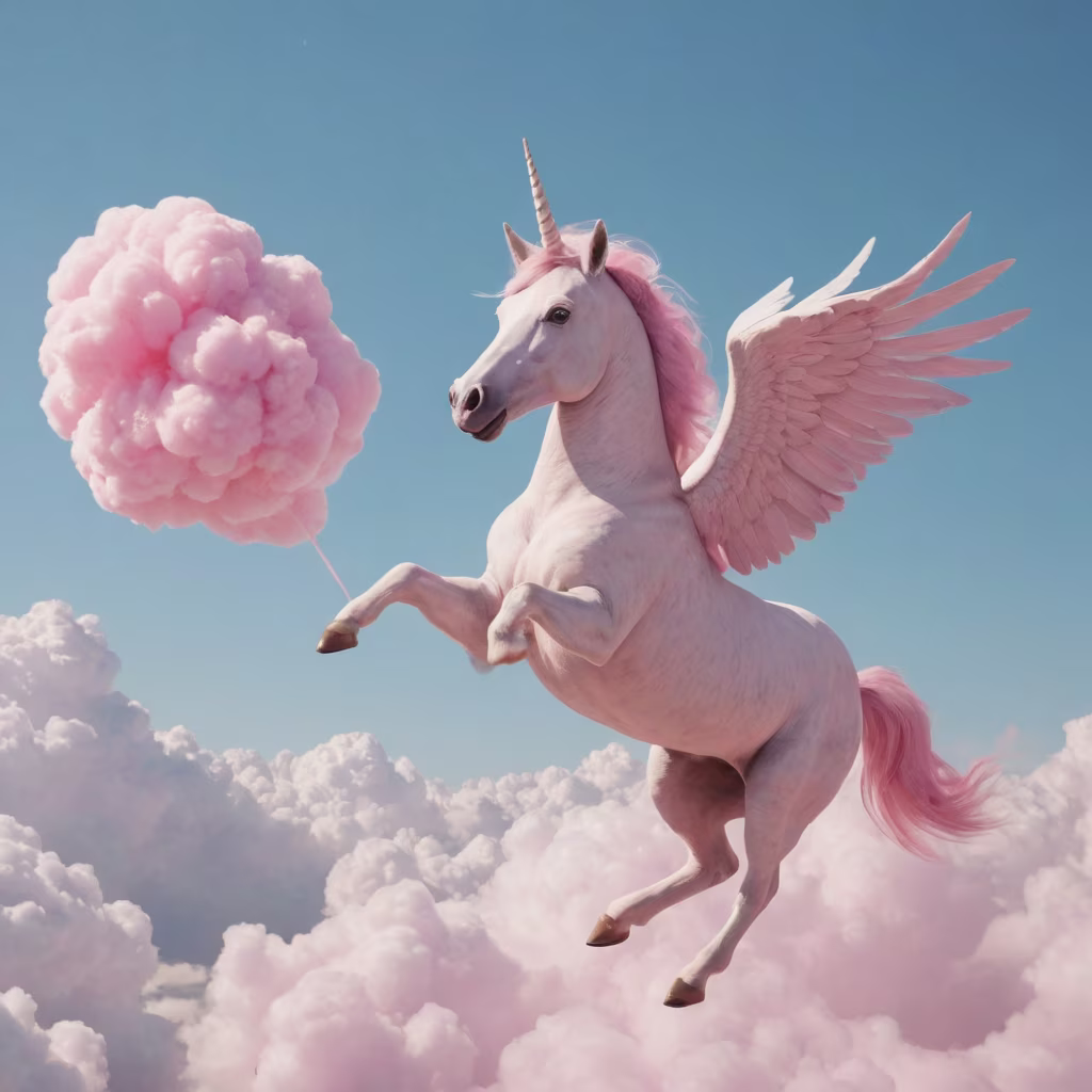 Prompt: unicorn with lots of colors on his hair and tail, in a magical place with clouds and a rainbow