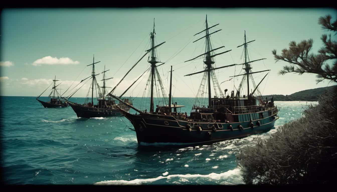 Prompt: sharp spikes rotating around thorns, trees made of steampunkcore material, the sky is green, the waves are clear, coral reef showing all the boats on the bottom of the ocean, abstract, deep feeling, unblurry, unfade