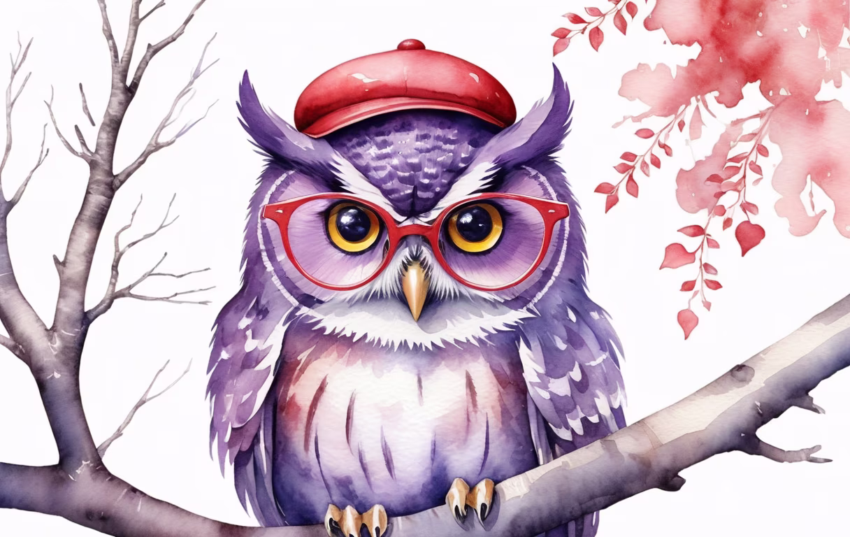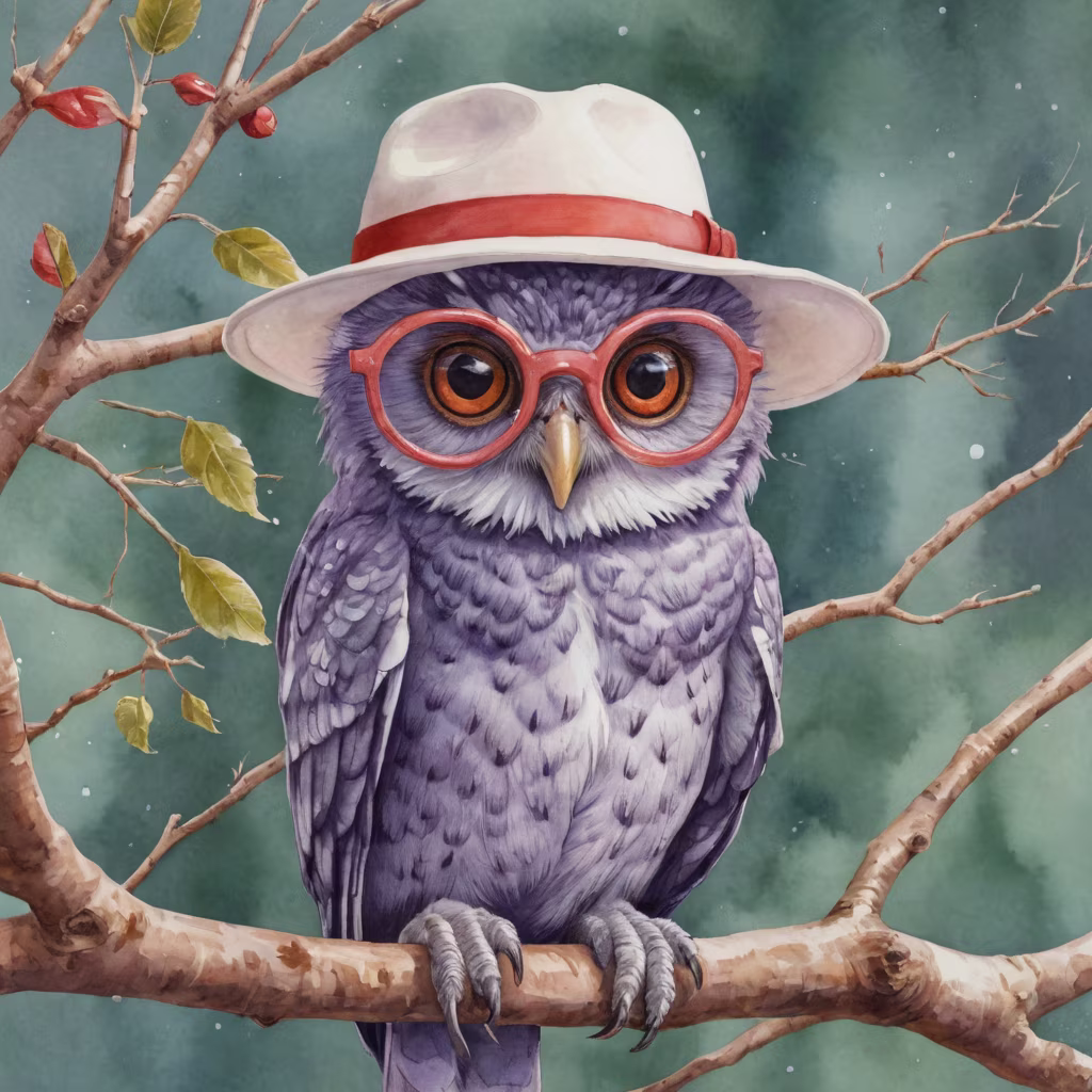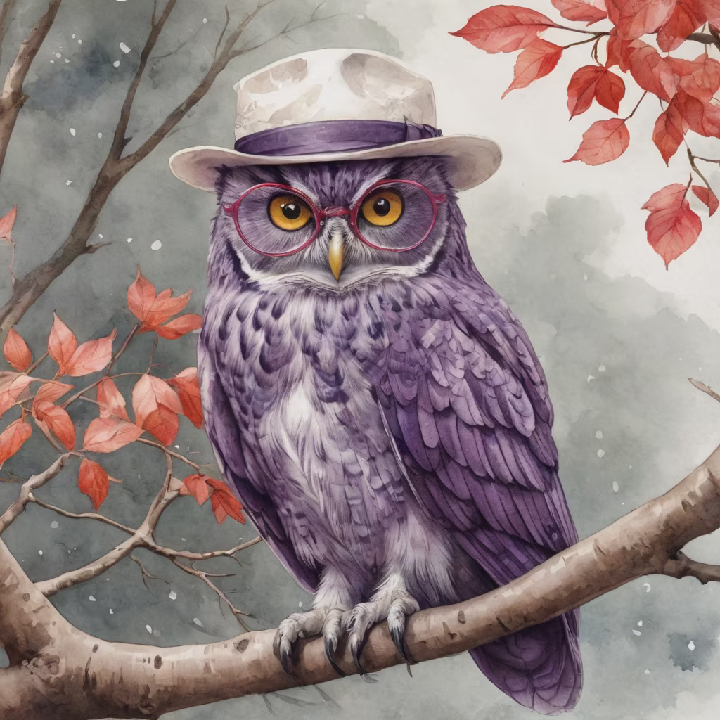 Prompt: a purple owl with a white pamela hat and red cat-eye glasses on a tree branch, the hat is big, the top is round and all white, the glasses are red and have big thick frames