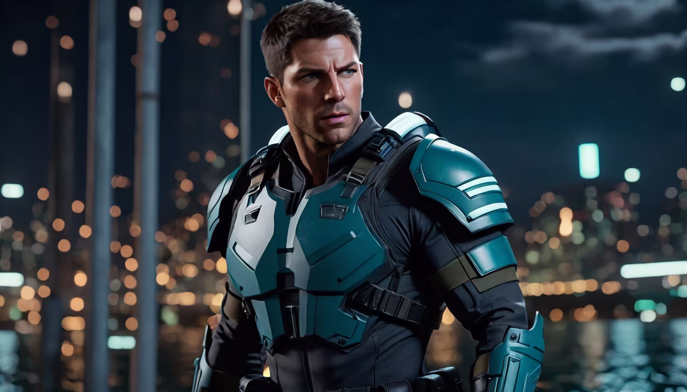 Prompt: hyper realistic, chris redfield wearing a bullet proof gray uniform, gray sleeves, cyan waist armour, pier night background