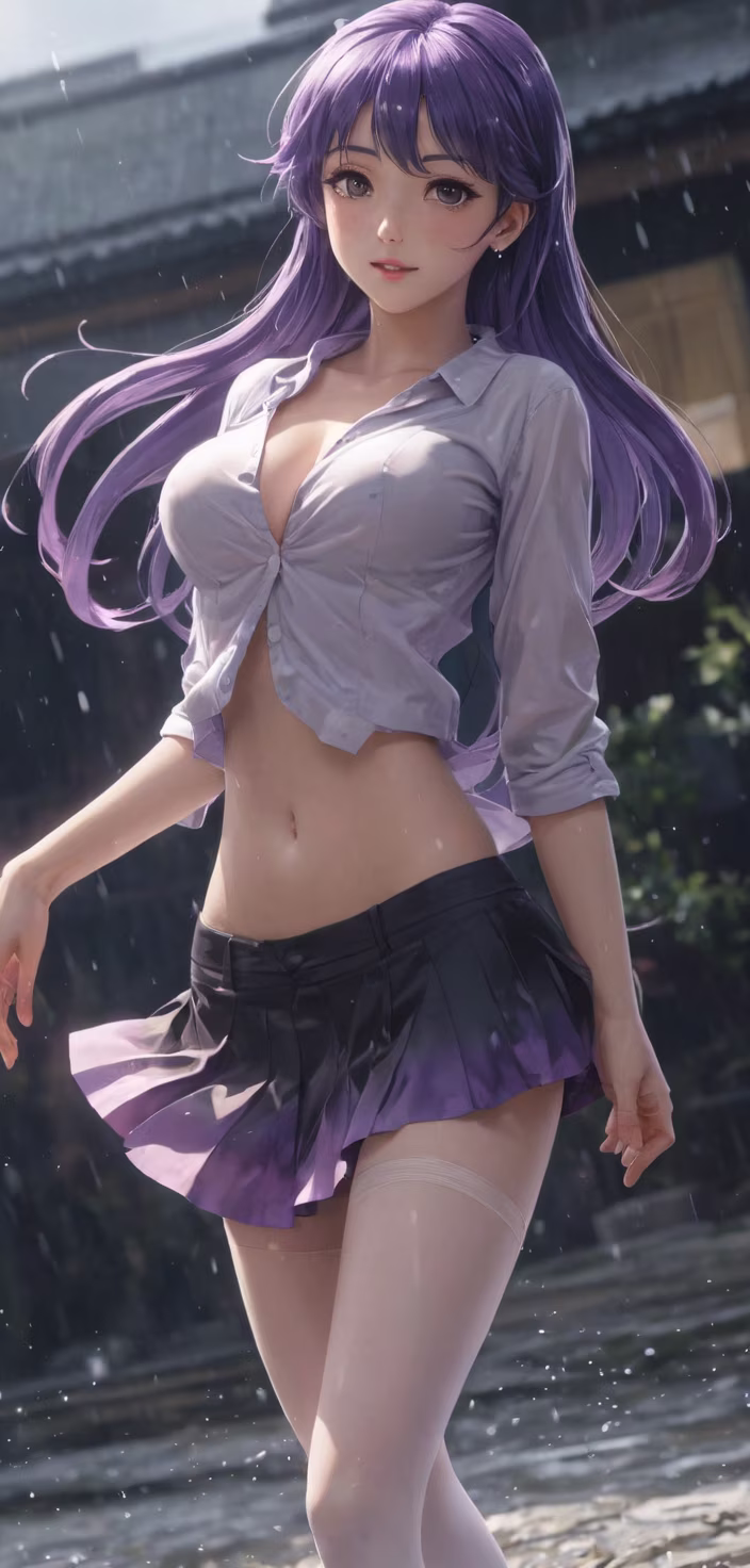 Prompt: Beautiful anime dream, rainy day, day with bright sunlight, angle of the viewer: low angle view, face and body with great detail, large marked waist, Twilight Sparkle from My Little Pony, human version, Twilight Sparkle hair, beautiful woman, Japanese student clothes, short black and purple skirt, tight white shirt, exposed navel, long and sexy thick legs, arms extended towards her waist, marked neckline, large upper breasts visible, transparent white stockings, bare arms and shoulders ,bare breasts, voluptuous breasts, long and silky hair, hair moving through the air, wet environment, wet skin, wet clothes, transparent clothes, beautiful white skin, reflective skin, visible panties, black panties, fine texture, lithographic style, bright, film, cinematic light, hyper detail, anime-ready, masterpiece, atmospheric, high resolution, high contrast, dark, watercolor,
