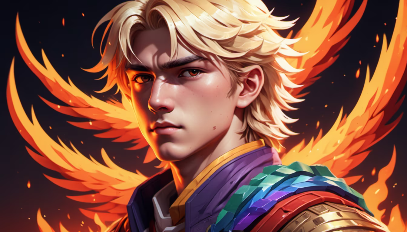 Prompt: 18-year-old male with his blazing Phoenix. first person perspective, with top down camera, in style close-up portrait, in this fantasy painting. Male adorned in golden armor, disheveled golden long hair, golden eyes, golden eyebrows, and golden eyelashes. Smiling eyes, handsome face, showcasing a youthful charm while exuding an irresistibly appealing and sexy allure. All around were flames and flame flowers. The mood is joyful and energetic. The style should be lively and whimsical. Use bright, warm lights to enhance the sunny atmosphere. Natural elements are incorporated in a detailed and intricate way, displaying intricate patterns and textures of fire and sun.Vivid HDR 64K is extremely complex. Add depth, add texture. Authors: artgerm, greg rutkowski, loish, and sakimichan. High-end brilliance. Every detail is meticulously designed to showcase a fairytale-like luxury. 12D UHM is crafted with golden velvet to create a magnificent image. AI for CodeFormer {{{v5.4.0}}} Deluxe models in ultra-realistic 12k HD