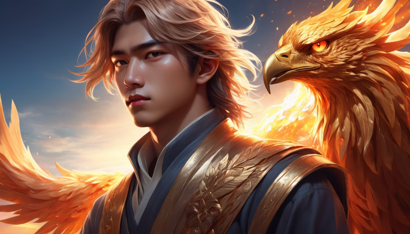 Prompt: A 16-year-old male, the legendary god, upper body portrait, looks like Song Jiang, next to him is an orange phoenix flowing in the fire, the background is the sky and the sun, messy golden long hair, golden eyes, golden yellow Eyebrows, golden eyelashes, smooth skin, delicate face. 4K Eye Features, High Detail Perfect Facial Features, Emphasis on Face High Detail: 1.4x 4K, 1.4x Dynamic Fire Glow (HD), High Background Detail++, Detailed Environment, 1024K, DHR, Double Exposure, Masterpiece, Selfie, Rainbow light, long shot.