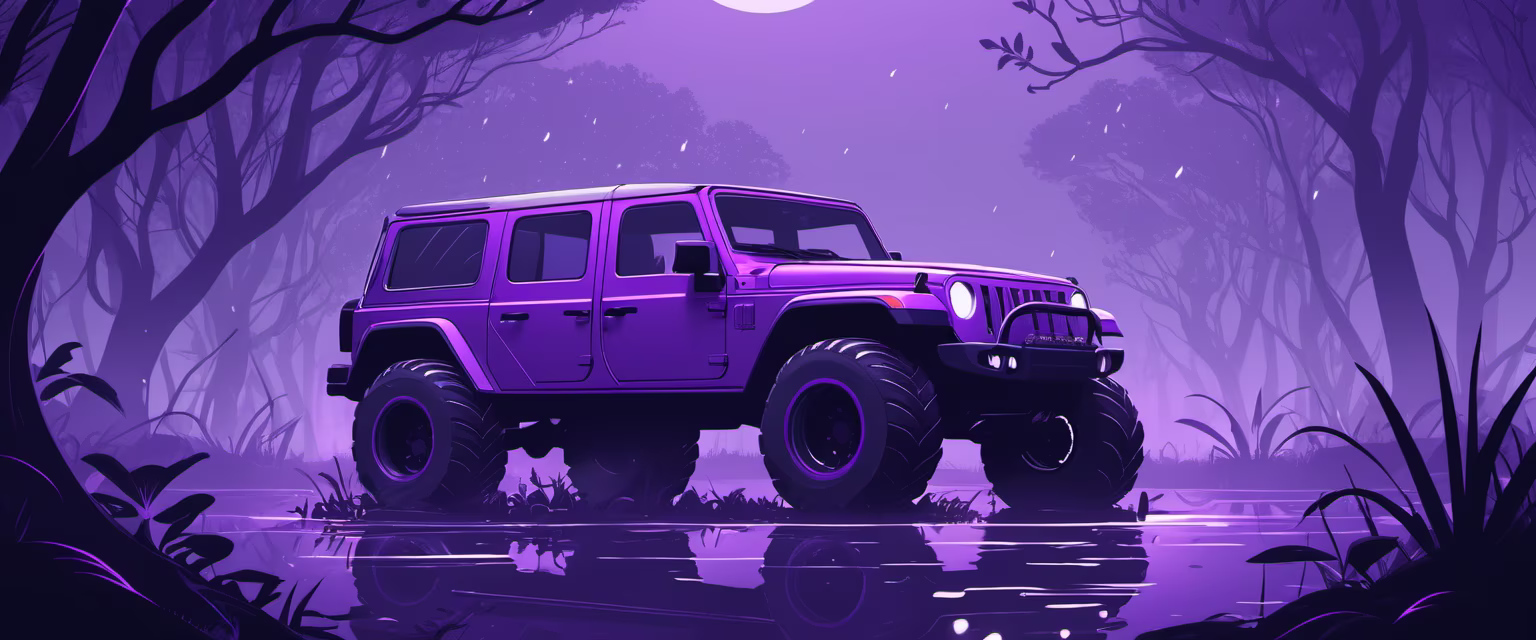 Prompt: Magnificent scenery with big tires, buried in the swamp, intertwined vines, frogs in the night mist under the moonlight, while soft purple rain falls. Unique aesthetics, providing a magical and immersive atmosphere.