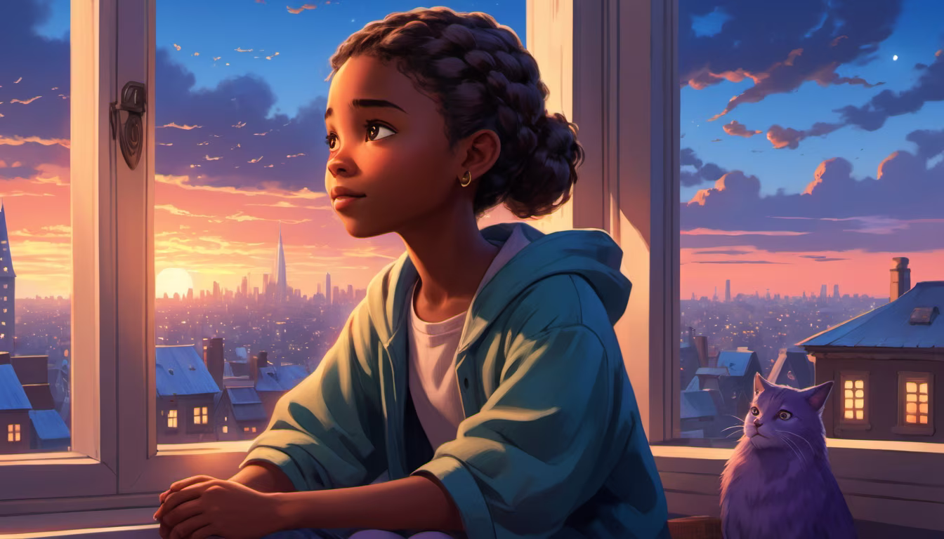 Prompt: Amidst the whirlwind of the city, we zoom into a cozy apartment where a young African American girl, Maya, sits solemnly by her window, staring at the city lights as dusk falls, Studio Ghibli, hand drawn, main character, 8k, ultra hd, hight quality
