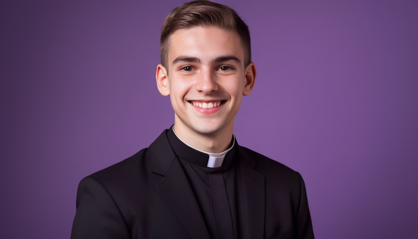 Prompt: Dnd style, young guy, purple skin, very small horns. round face. Calm look. Regular clothes. Portrait against a gray background