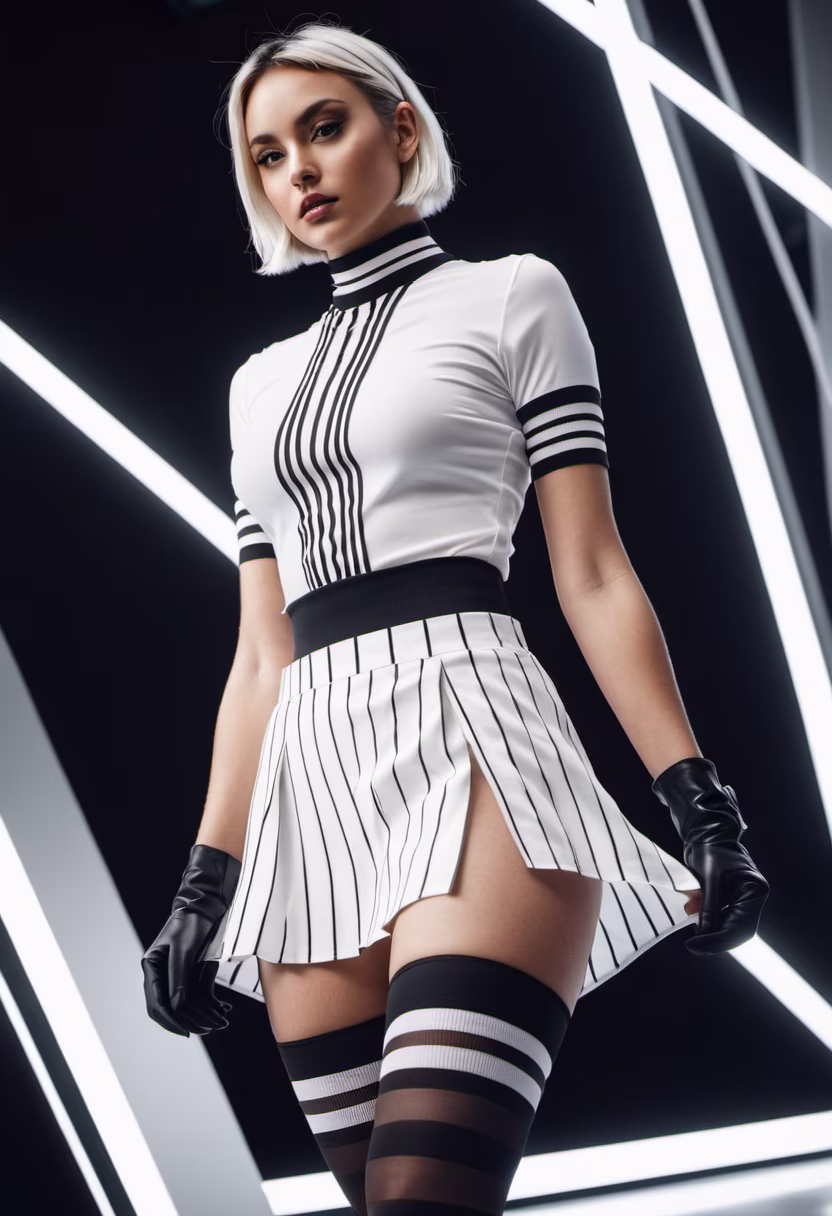Prompt: a black and white photo of a woman in stockings, a photo, tumblr, white outfit, stripes, sporty physique, choker, Fujifilm Superia, Gamma, Megapixel, EGA, Visual Perception, Beautiful Lighting, Accent Lighting, Ray Tracing Reflections, De-Noise, Shaders, OpenGL-Shaders, Post-Production, Tone Mapping, VFX, SFX