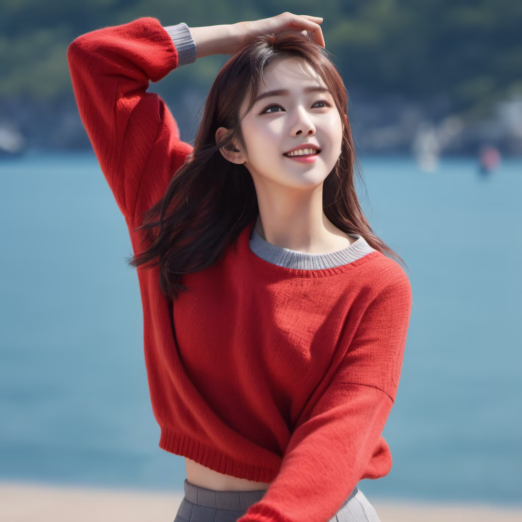 Prompt: best quality, ultra high res, RAW photo, realistic, (solo), (photorealistic:1.4), a girl in red sweater and grey skirt, dancing on an sea bay in a bright sunny day, the stage has no roof and has direct sunlight, she is looking at viewer, iu1, (iu), (lee ji eun), smile, small eyes, half-closed eyes, daytime, beautiful, masterpiece, extremely detailed face, perfect lighting, ultra detailed, bloom, (kpop idol), depth of field, small breasts