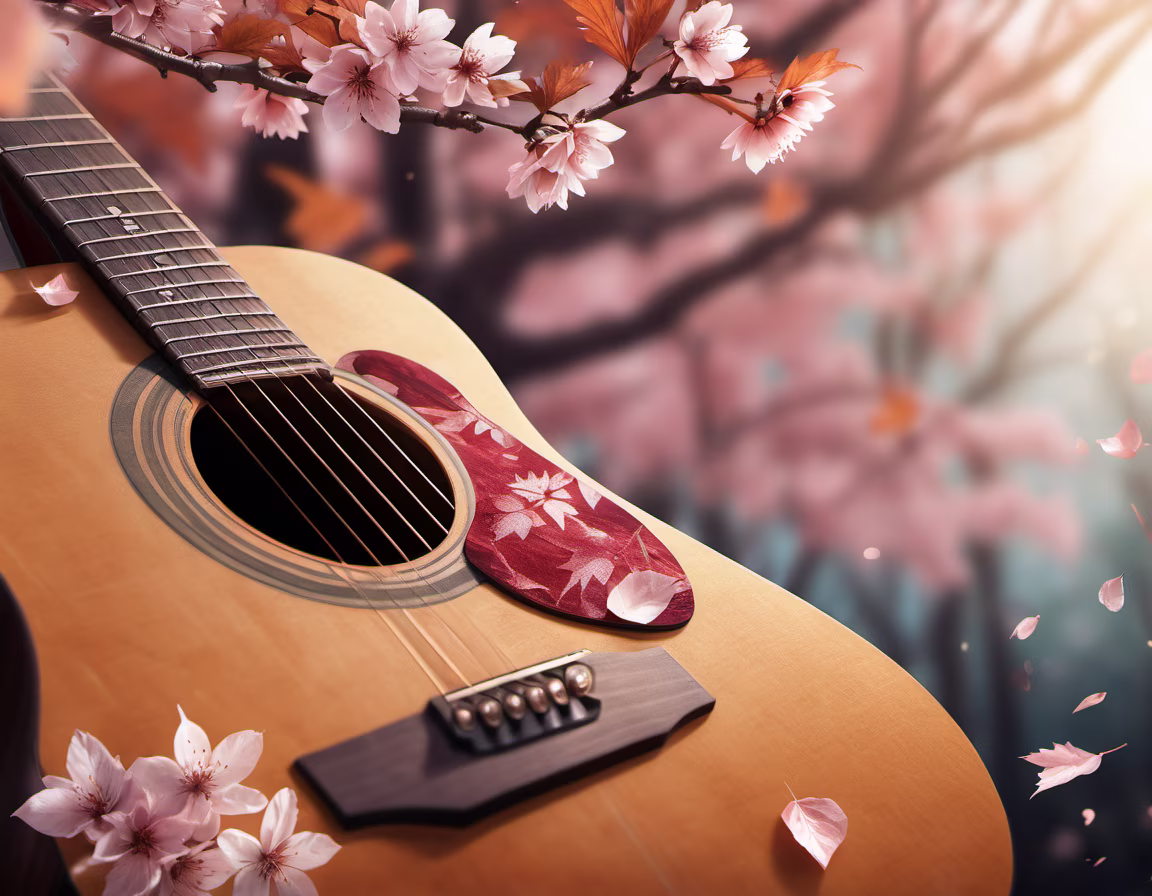 Prompt: Poster for a acoustic live music event with smooth music only guiter,autumn season,cherry blossoms surrounded,maple leave shredding,poster design,no title,4k