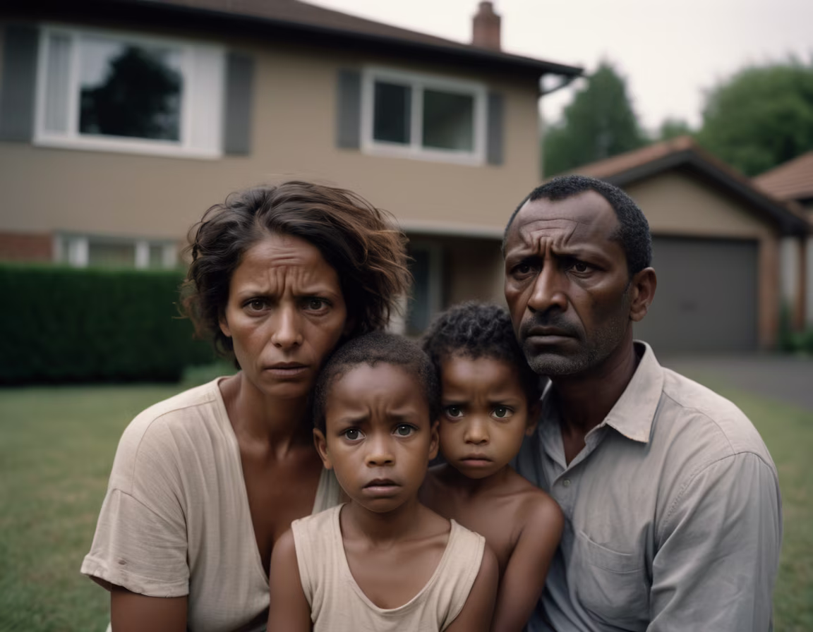 Prompt: Documentary Photography, camera in WS, wide shot. Father, mother and child, with brown skin and broad nose, in front of their house with a sad look. The image is extremely detailed, portraying intense human emotions in a sincere and wabi-sabi style. Without makeup, completely natural, highlighting imperfections, captured in natural light, with a momentary shot on Agfa film, using a Hasselblad camera, in a specific photographic style. Style: Cinematic