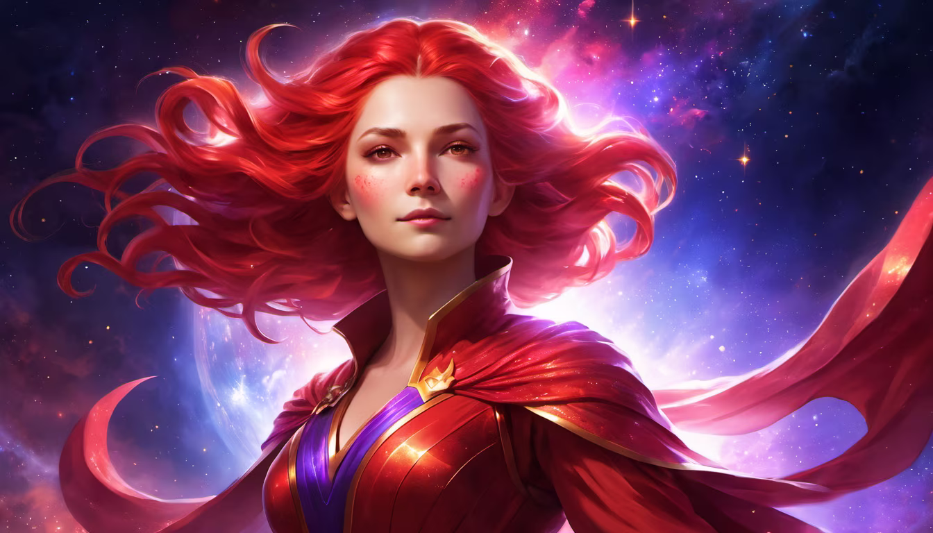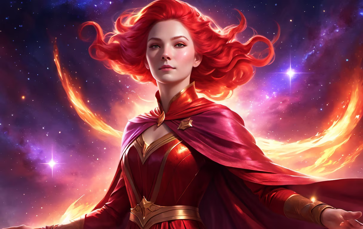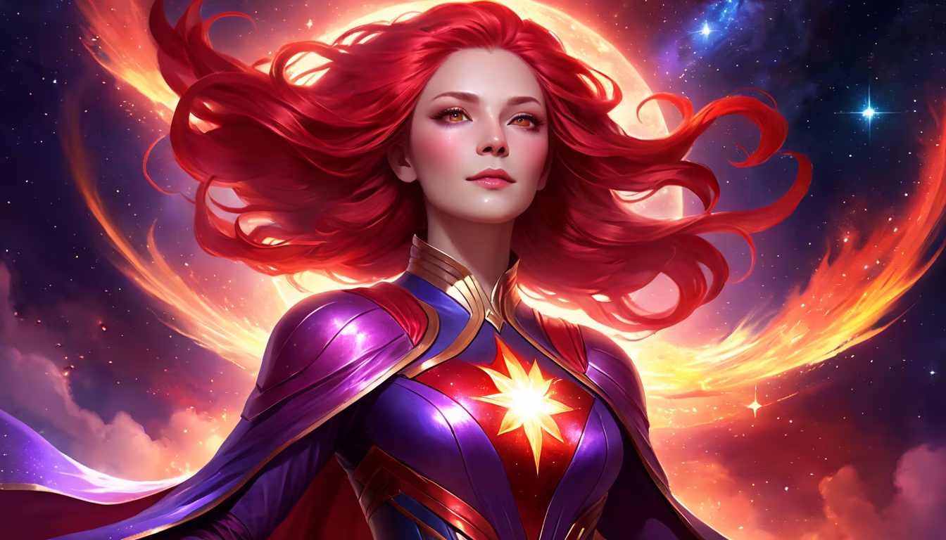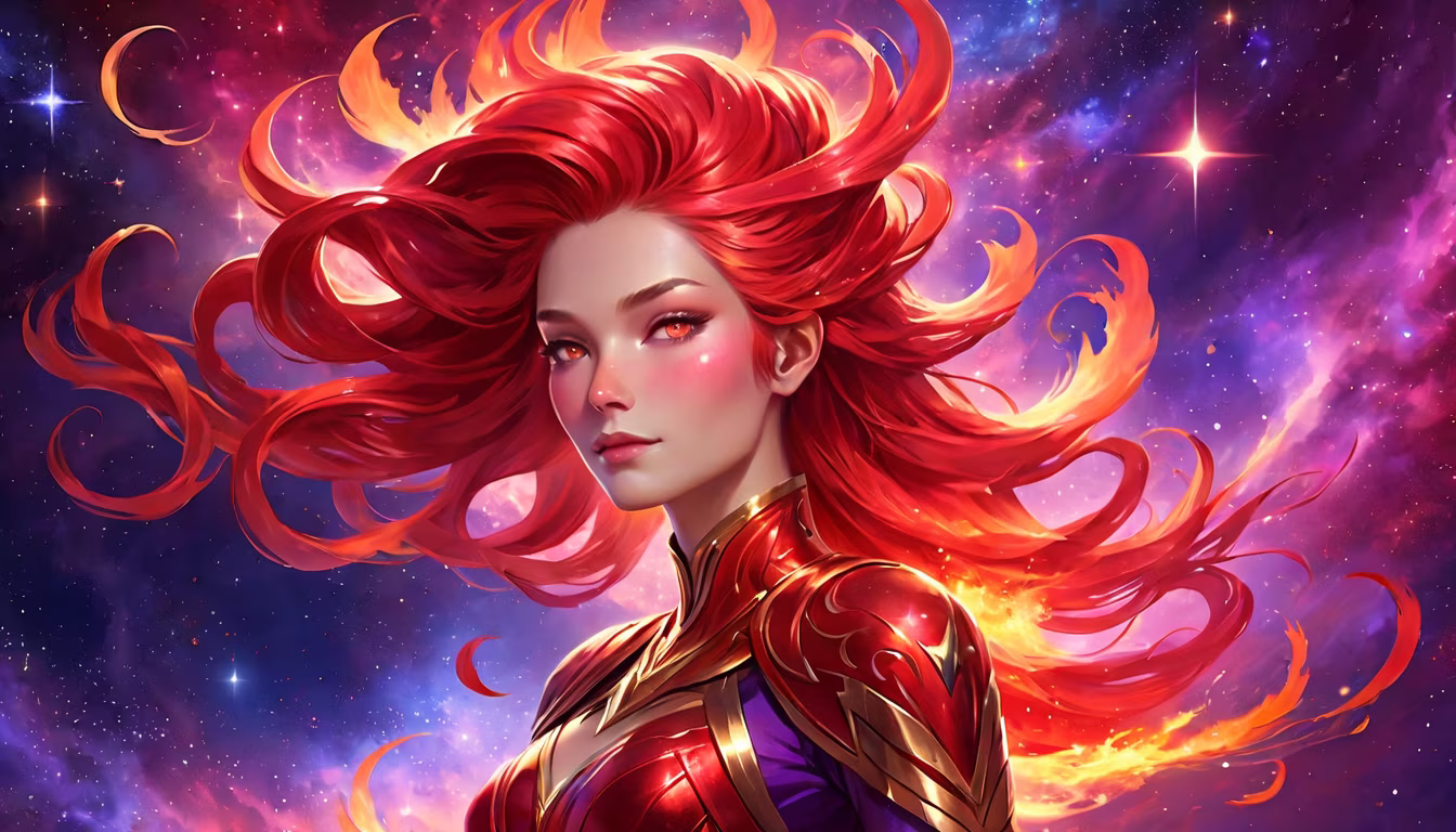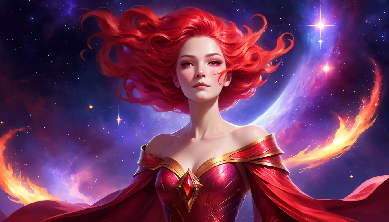 Prompt: ((Superbeing woman)) with (((red nebula stellar skin))) and flaming hair, clothe is Iridescent lilac and red glowing dress, background is universe
