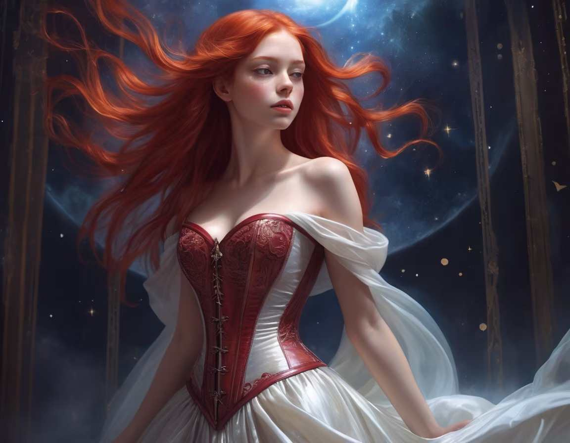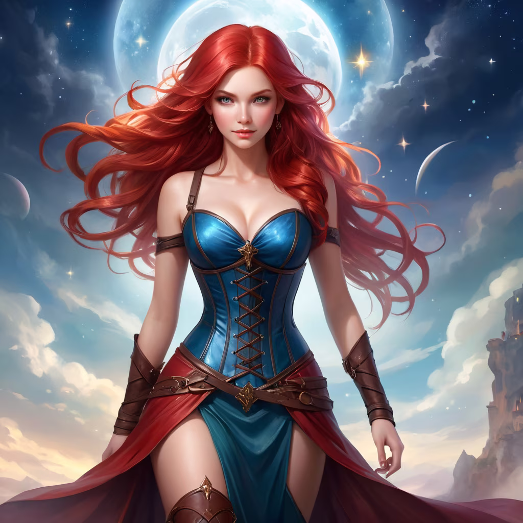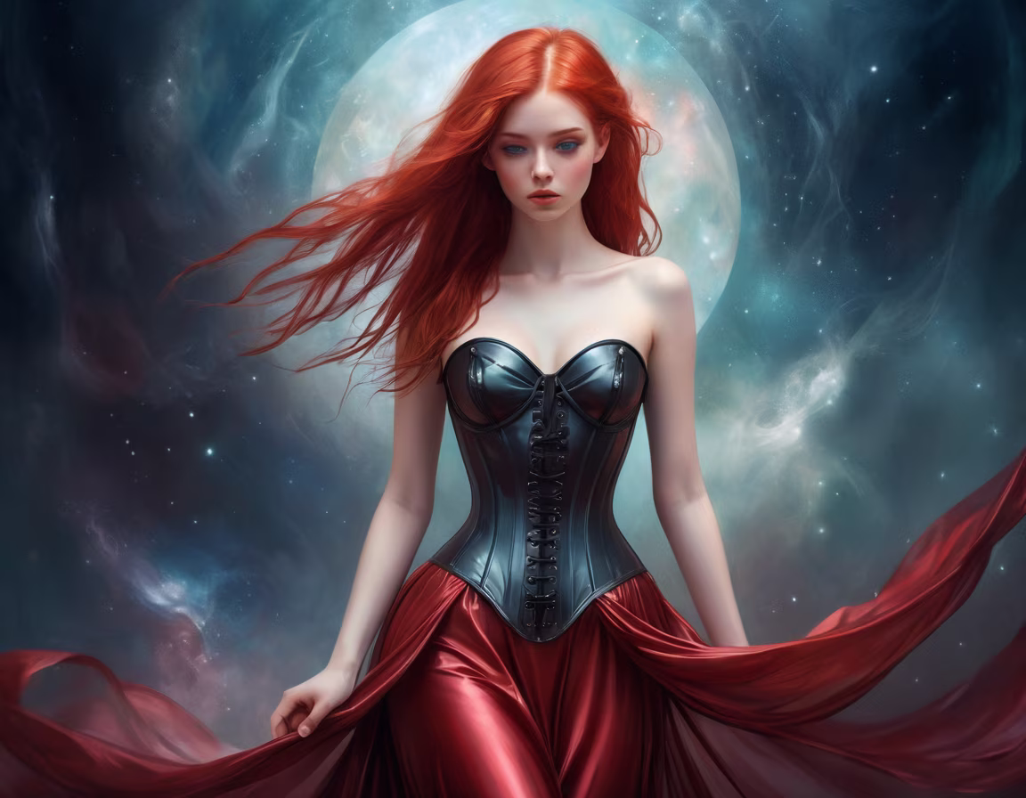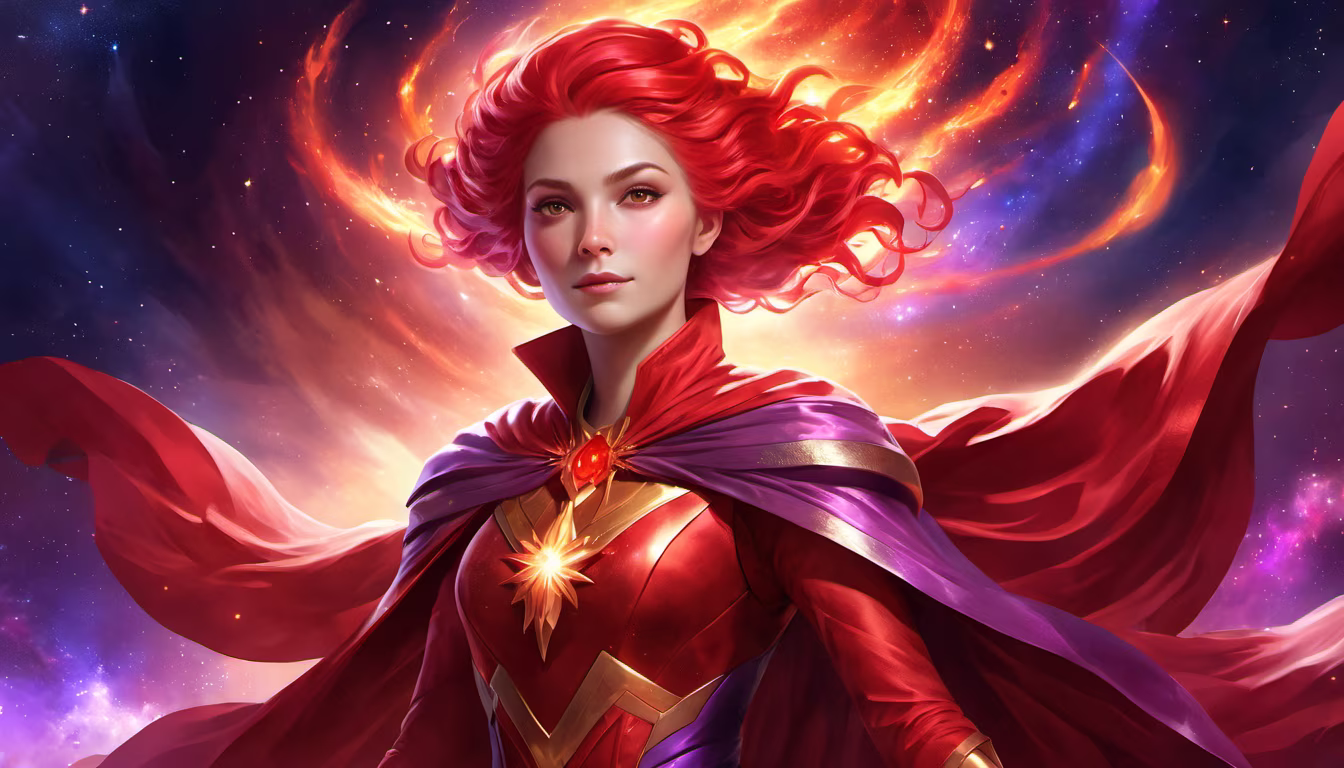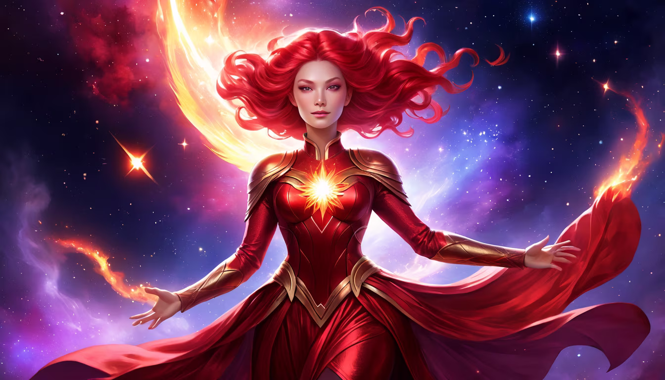 Prompt: ((Superbeing woman)) with (((red nebula stellar skin))) and flaming hair, clothe is Iridescent lilac and red glowing dress, background is universe