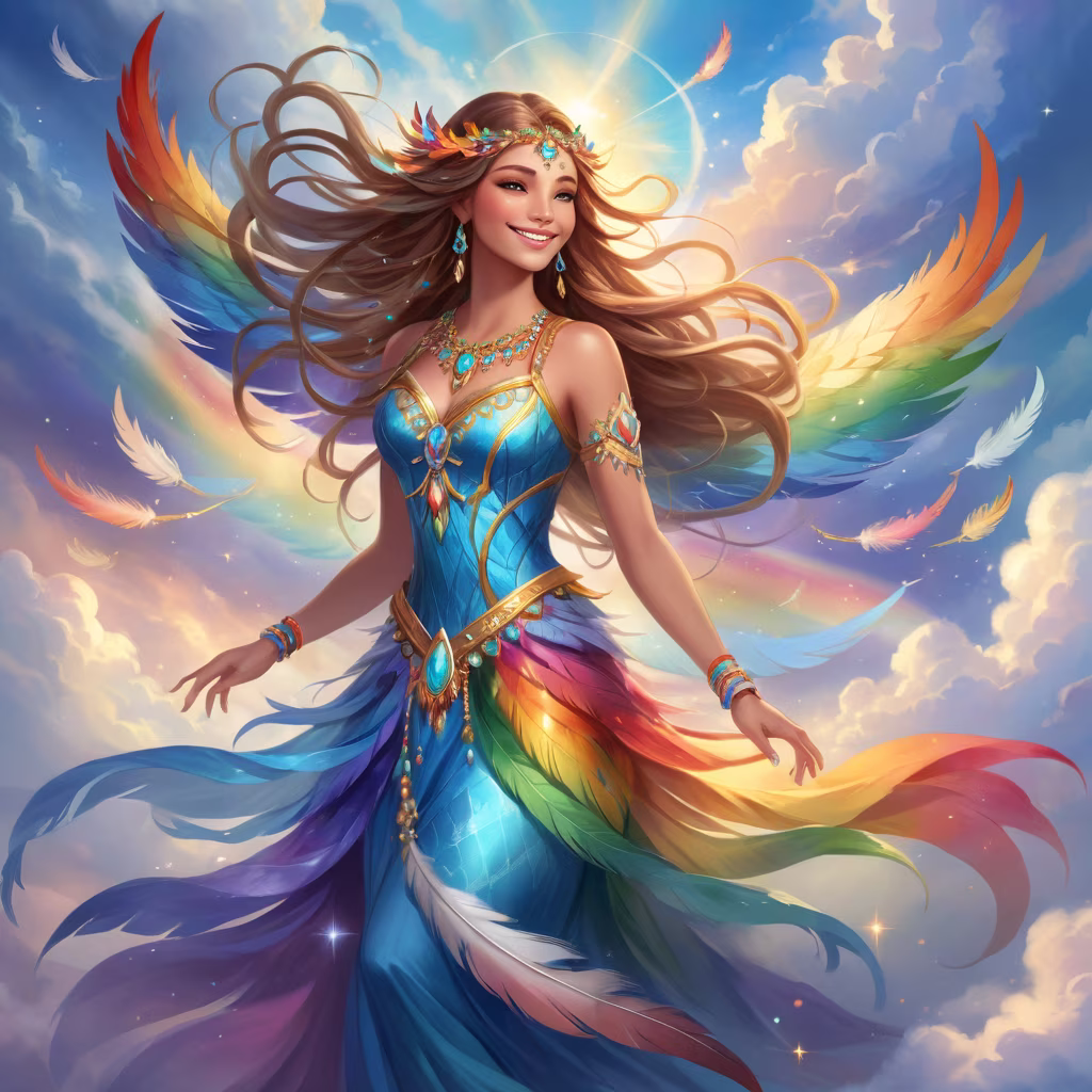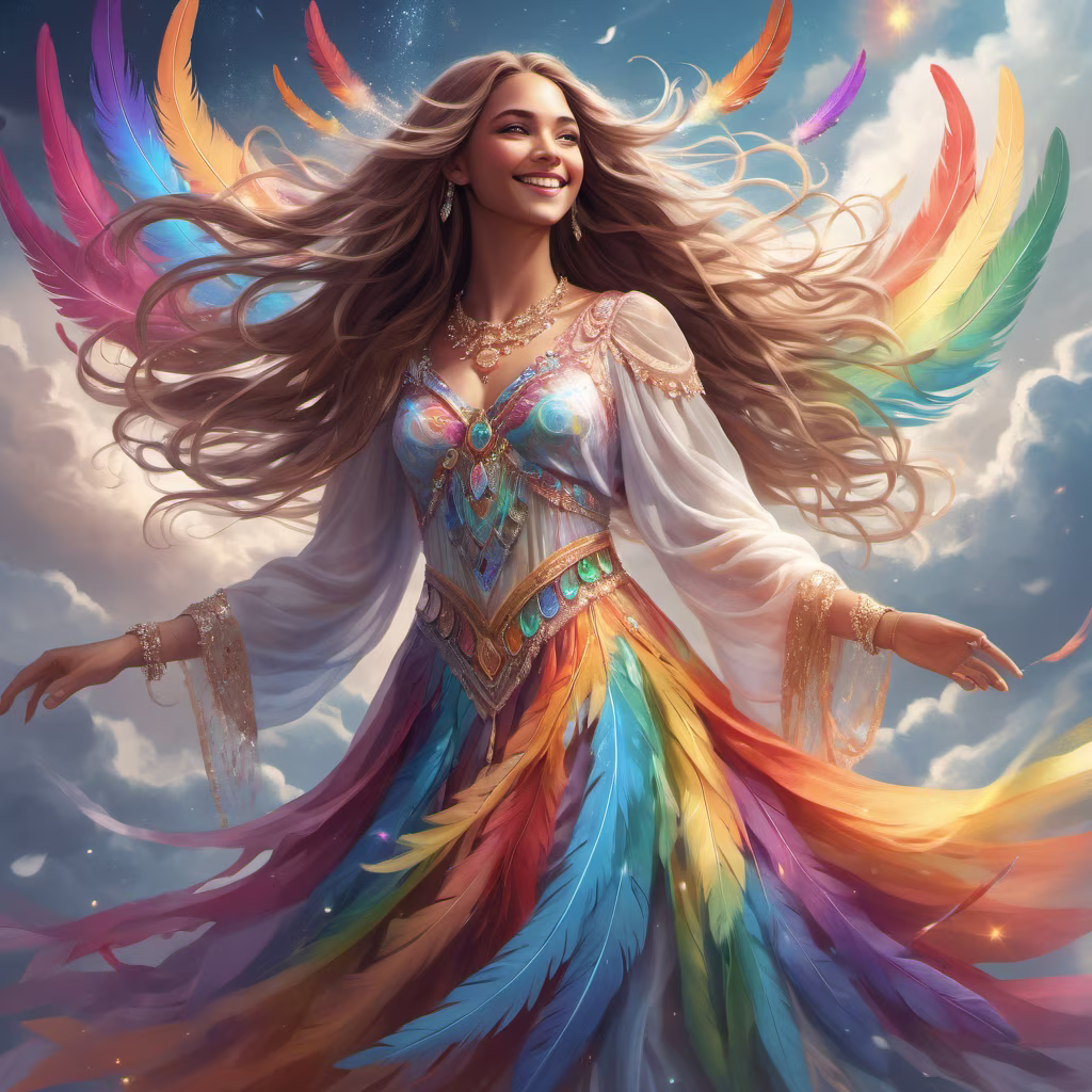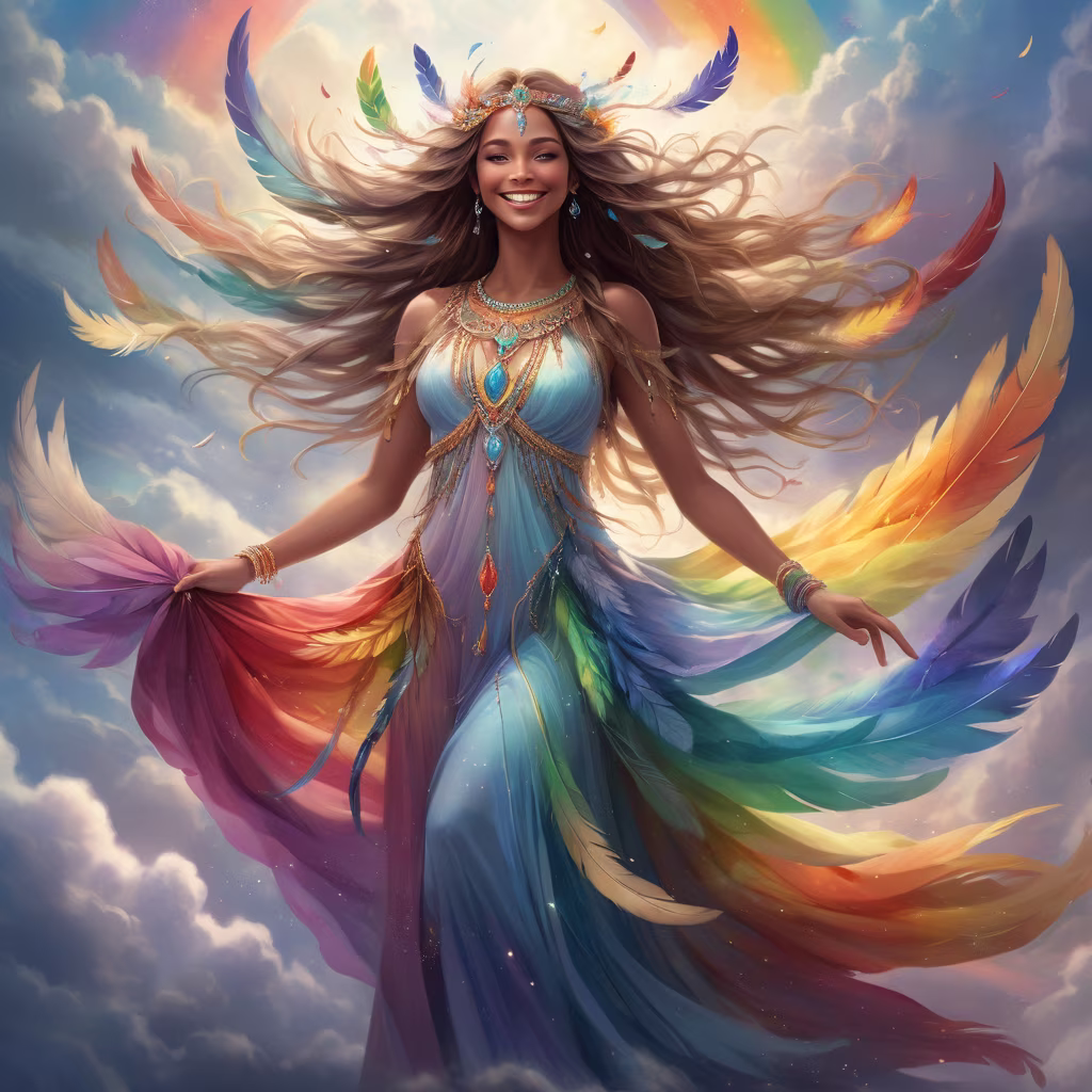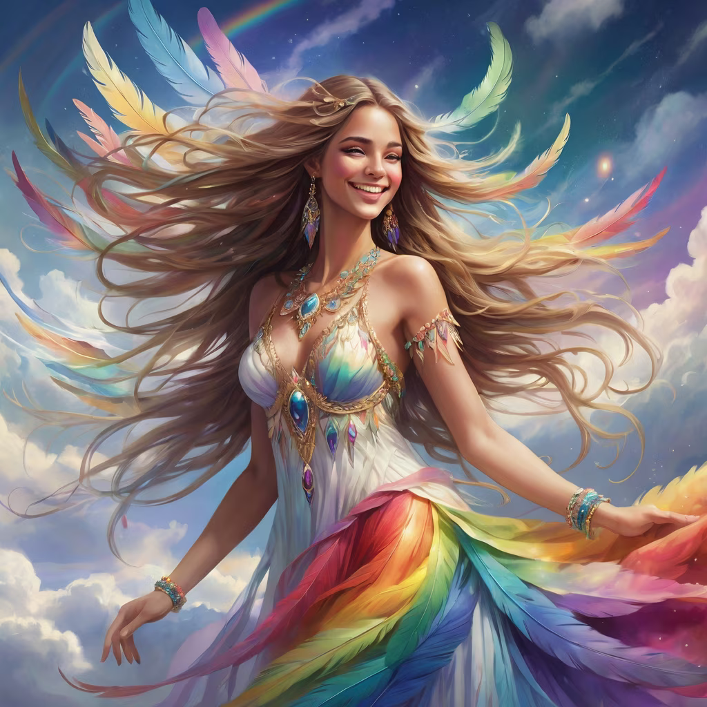Prompt: a beautiful goddess with long hair flying through the clouds, rainbow feathers adorn her dress, a beautiful smile on her face, jewels of varying colors on her dress