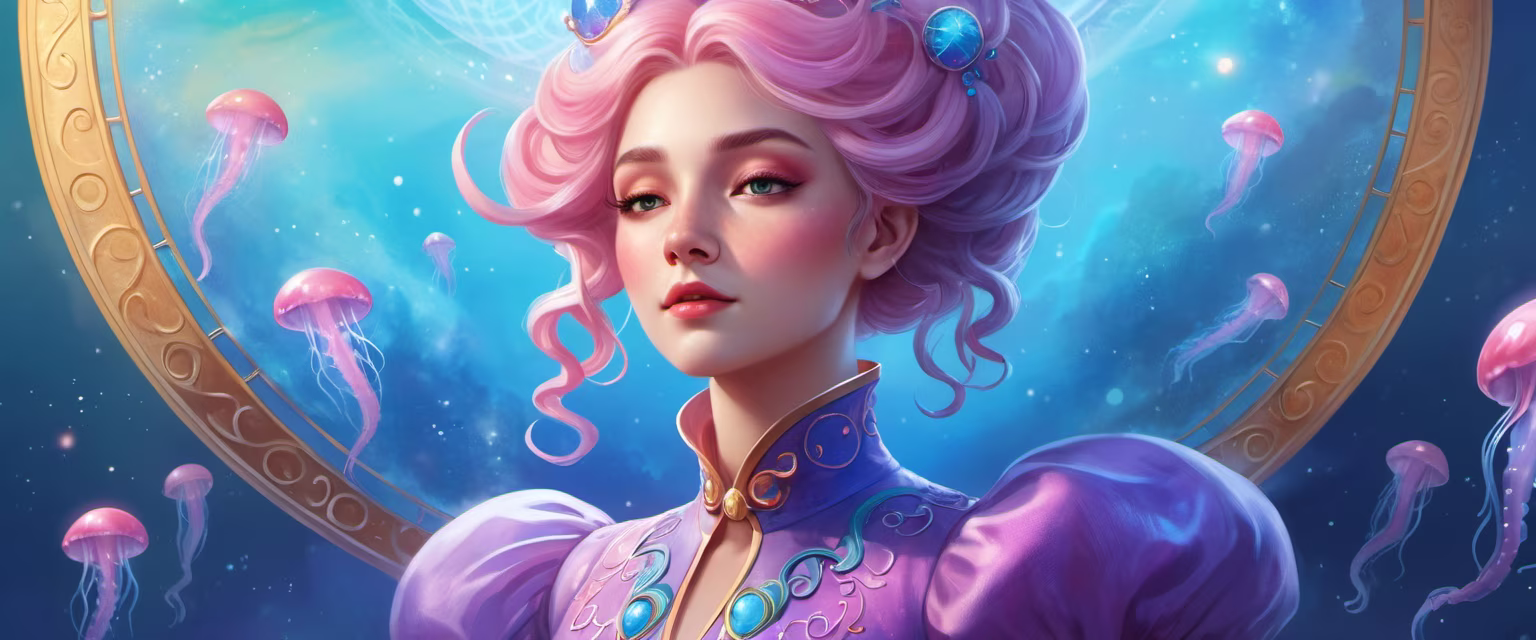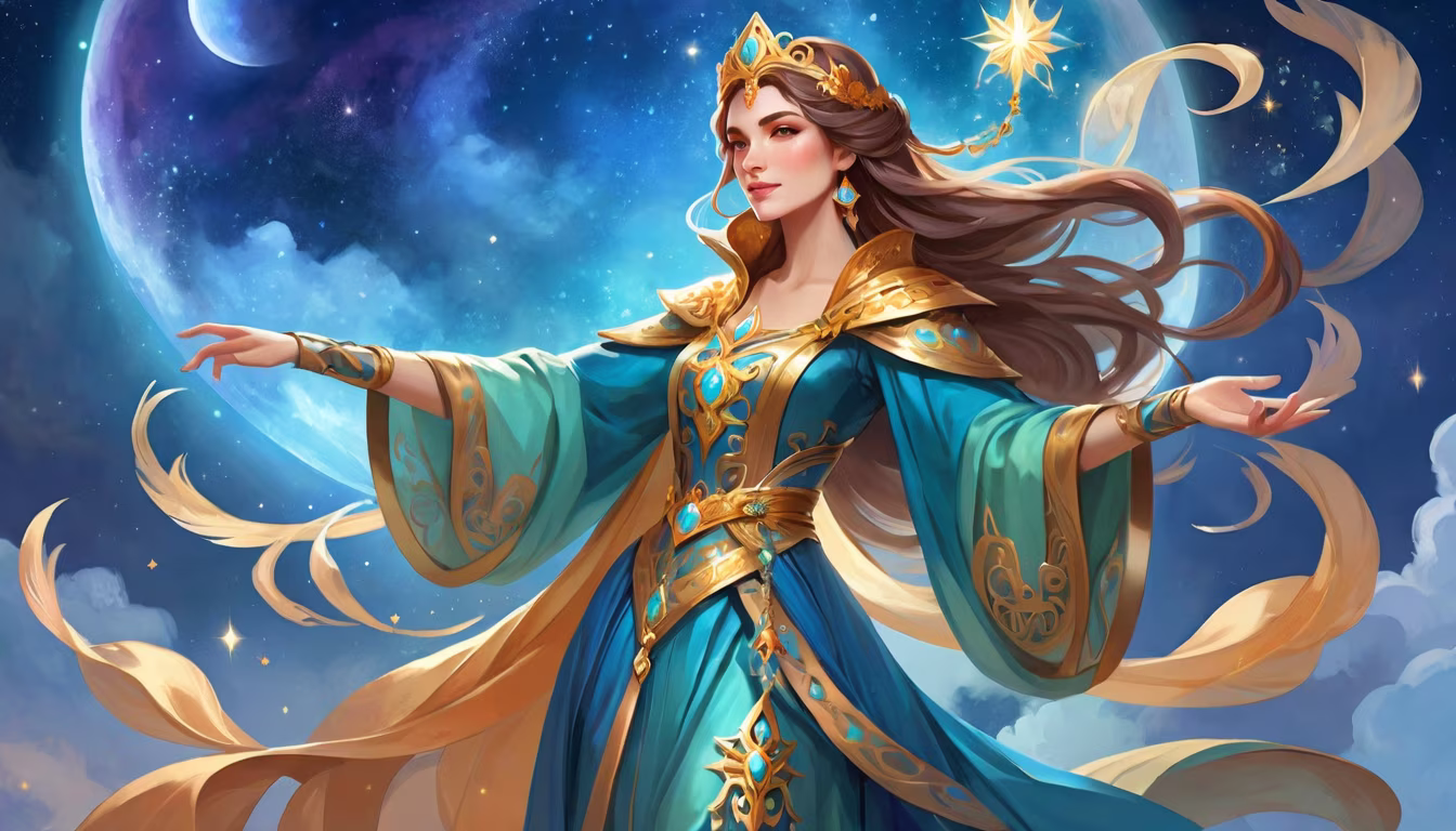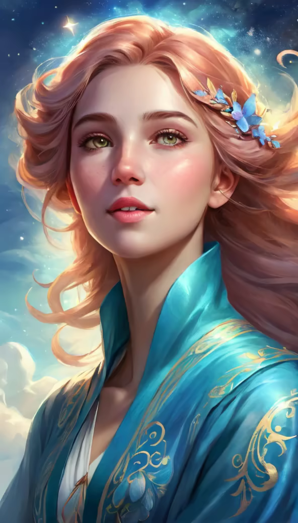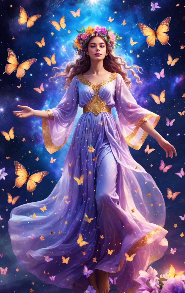 Prompt: the star sign of libra personified as a person, flower crown, royal clothes, Barefoot, dancing posture,galaxy sky,Extremely luminous and bright design,Surrounded by glowing butterflies
