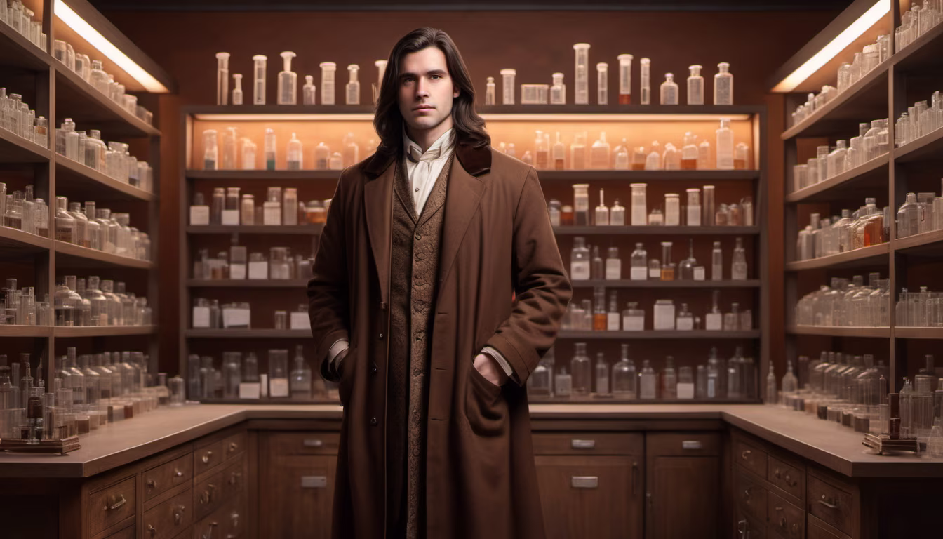 Prompt: a male with long dark-brown hair standing in a laboratory, wearing aristocrat robe, wearing brown coat, highly detailed, best, beautiful, masterpiece, symmetric, symmetry, shelves in the background, test tubes on shelves, warm colors