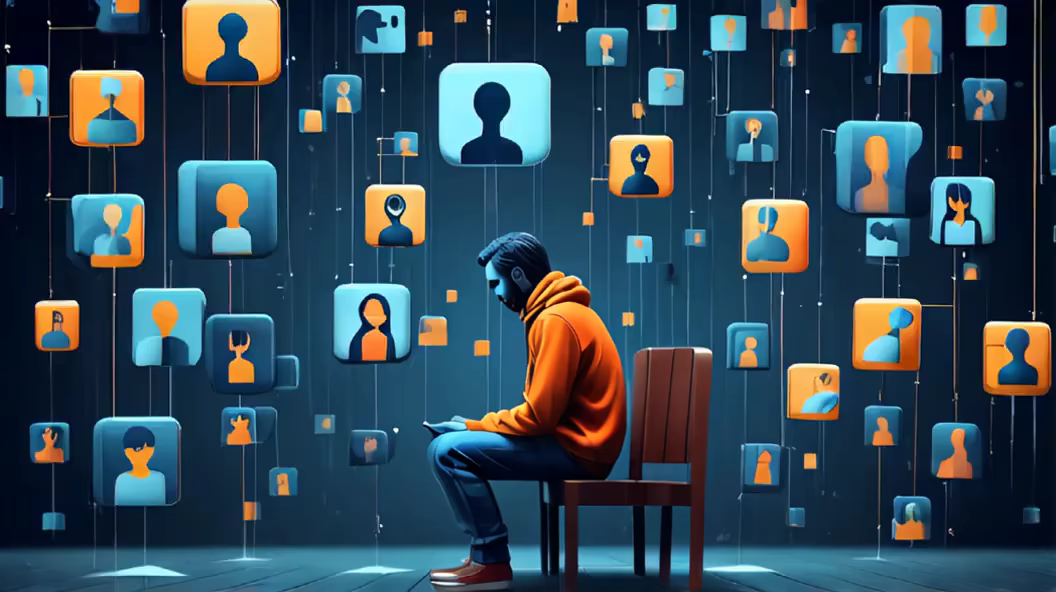 Prompt: an abstract image, illustrating that, the people still be lonely, although he has much connect in social media or short video apps in the virtual network.