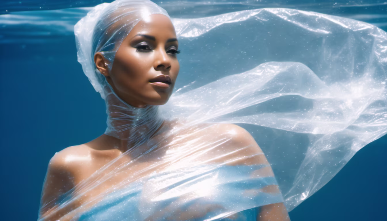 Prompt: Closeup bald headed African American supermodel: 1.7, underwater, dreamy, (plus sized), high fashion wrapped in saran wrap, (plastic wrap as clothing: 1.9), (dynamic pose), optical illusion, masterpiece ballet, 70s album cover, realistic sheen, third person perspective with facial features partially in frame, surreal, analog photograph, vintage (aged and worn)++, pyschedelic: 1.2+, holographic illusion, serene and somber, haute couture, (realistic water), (realistic plastic), afro wafting underwater currents, lens flare+++, interesting angle and perspective