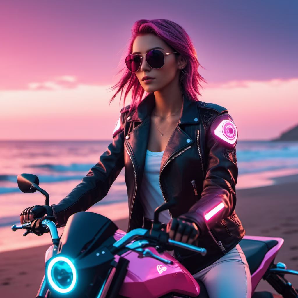 Prompt: cyborg girl, on a motorbike, cyberpunk, pink light, sunrise at the beach, light scene, realistic