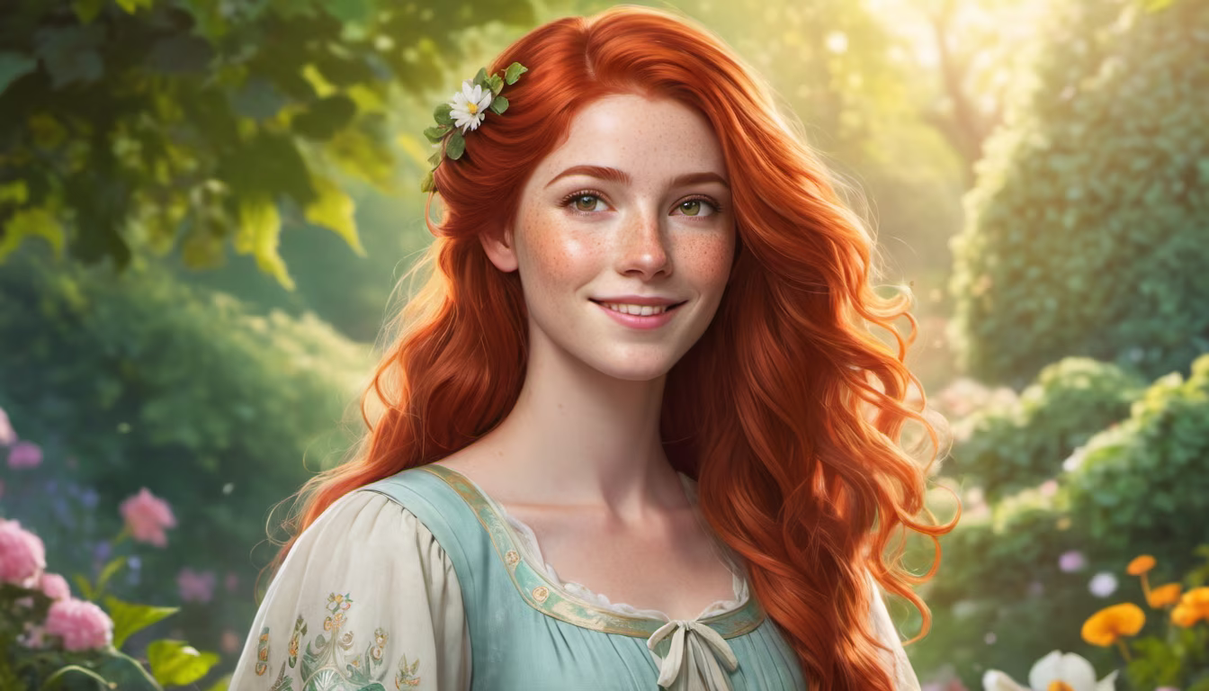 Prompt: Create an image of a gorgeous woman approximately 25 years old, redhead, 3/4 body view, an Irish woman with freckles, a smile on her face, she is wearing a loose crop top, the background is a beautiful English garden, ((perfect body))
