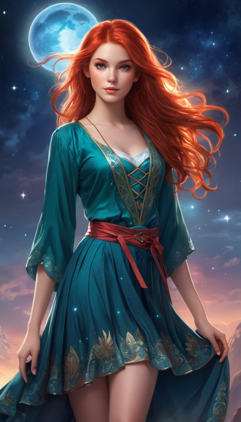 Prompt: fantasy character concept art, full body, highly detailed, scholar aesthetic, red haired woman wizard wearing blue robes and golden glasses.