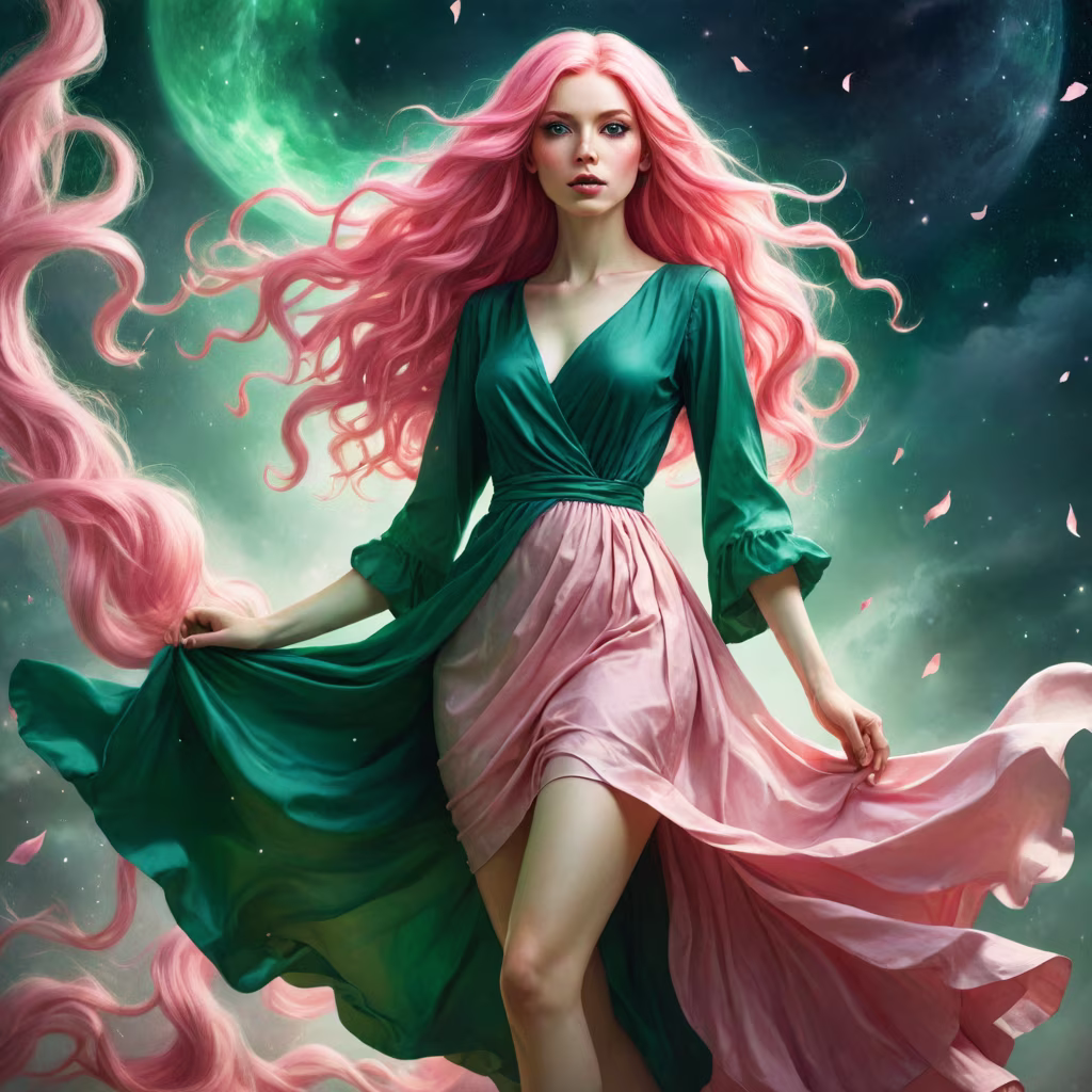 Prompt: Extermely beautiful female with long flowing Pink hair, wearing a green mini dress:1 and Red high heels:1