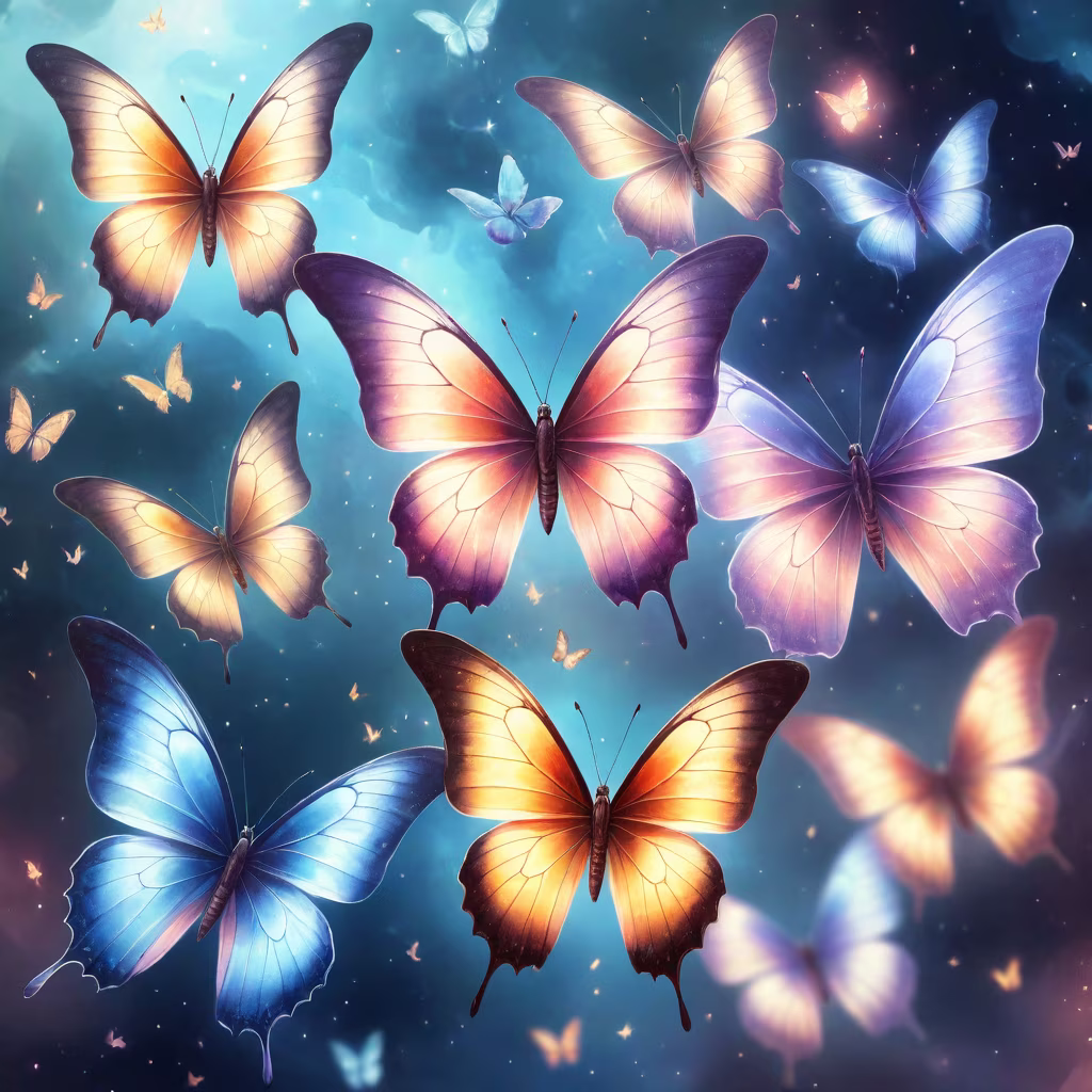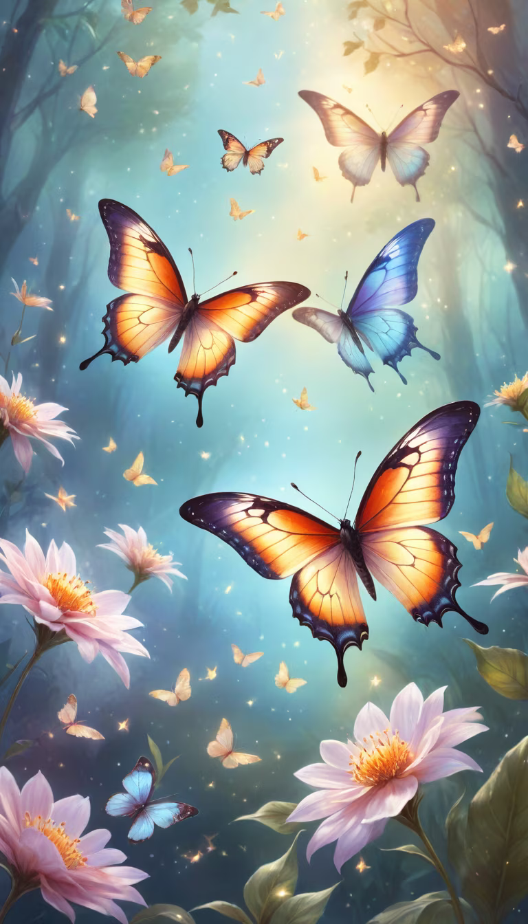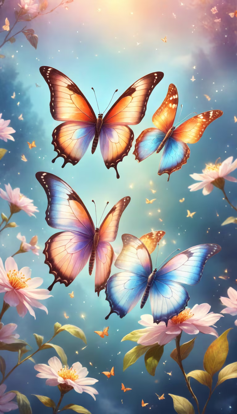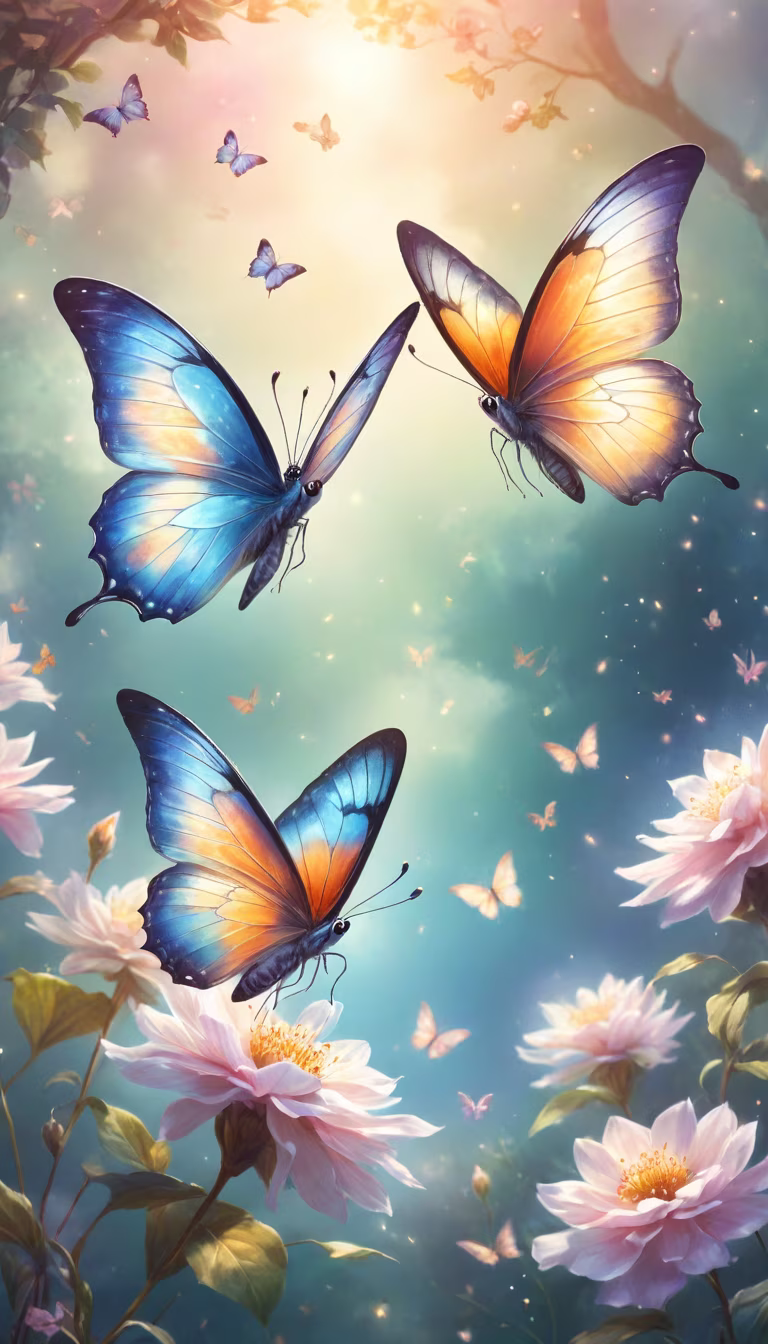 Prompt: two divine butterflies in a peaceful landscape, exquisite, poetic, feels warm and hopeful, tells stories, incredible meeting