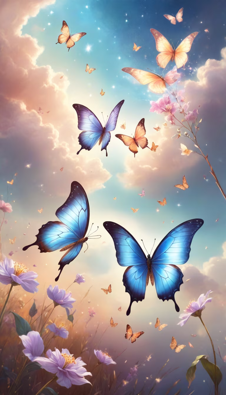 Prompt: only two divine butterflies in a peaceful landscape, exquisite, poetic, feels warm and hopeful, tells stories, incredible meeting