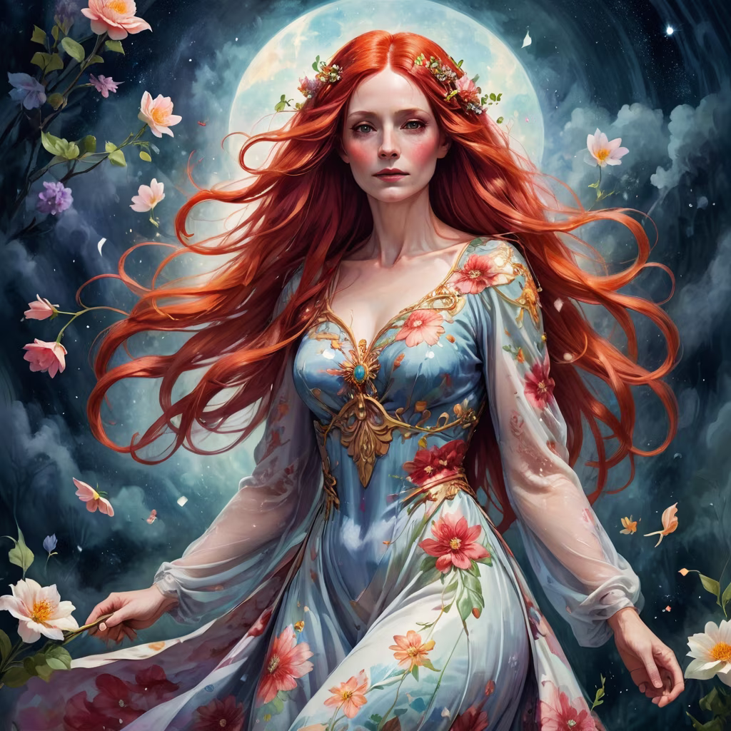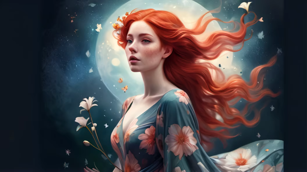 Prompt: A mid-size young woman with elements of nature, such as petals and butterflies, gracefully integrated into her hair and shoulders, wearing a patterned dress with belt