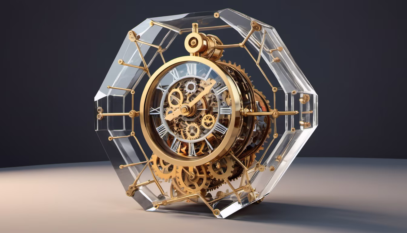 Prompt: surreal alarm clock made of gears and clear laminate panels plexiglass steampunk style