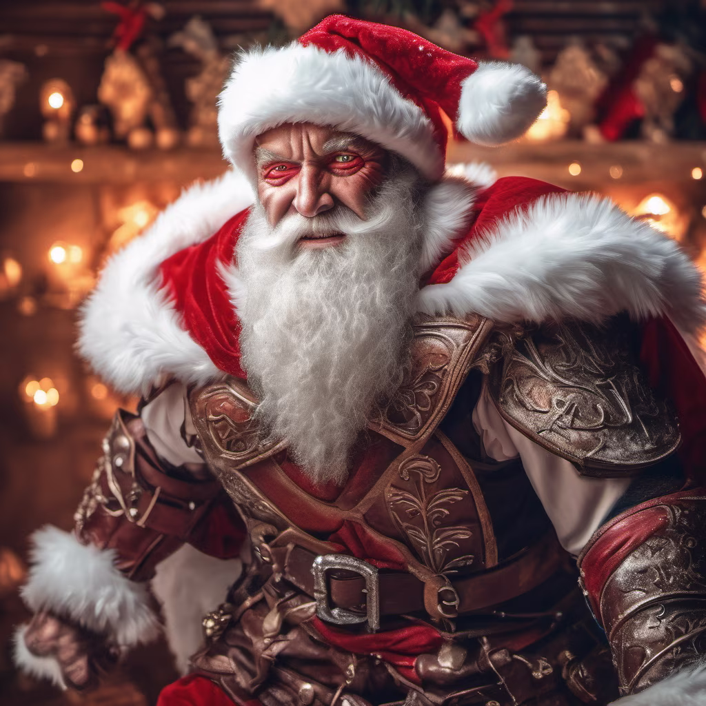 Prompt: a realistic photo, old man warrior dressed as Santa Claus, magical beautiful face color, glamor style Santa Claus hat, piercing eyes, global paint trail, hdr, 8k, wearing ornate armor with red details, battle pose