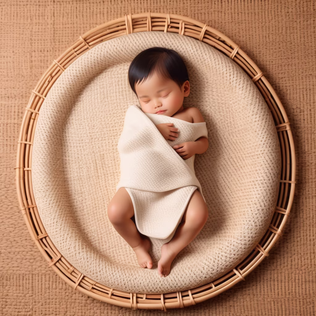 Prompt: The cute child is sleeping sweetly on the rattan mat. The picture shows the whole body , 45 degree viewing angle \\